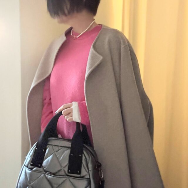 50代のアクセサリー選び 黄色のカラーパンツとbagの色リンクコーデ