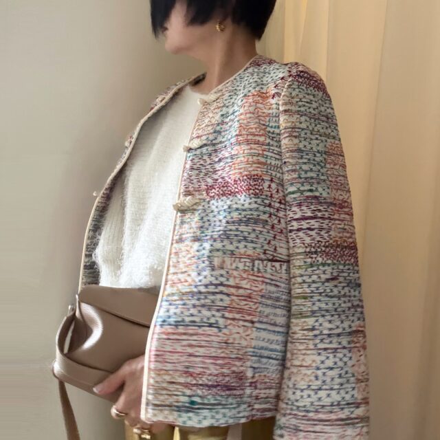 50代のファッション カラフルなツイードのジャケットに辛子色パンツの春コーデ
