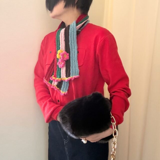 50代のファッション 手編みのカラフルマフラーと デニムスカートのコーデ