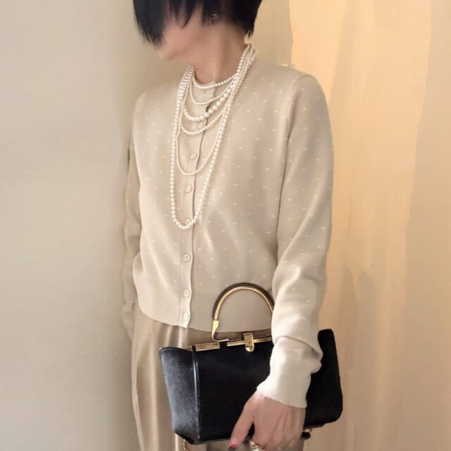 50代のファッション 水玉模様のニットカーディガン パンツ合わせでキレイ目コーデ