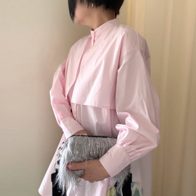 50代のファッション 千鳥ヶ淵 お花見コーデ ピンクのバンドカラーシャツ