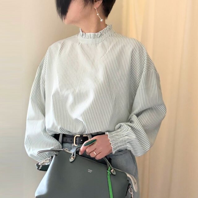 淡いグリーンのストライプが春にぴったりのブラウス。 このブラウス、届いてみて驚く。アイロンかけよう・・・思ったらほとんど畳みジワがない。フワッとハリがあるポプリン素材。 袖がゴムシャーリング。首も手が届きやすいファスナー。一人で楽に着れる。...