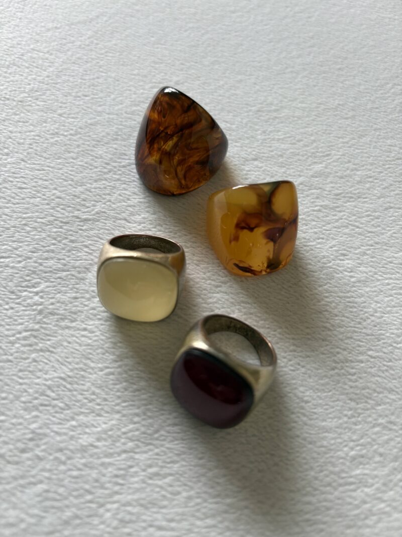 べっ甲風の指輪も便利。茶系のコーデに効く。