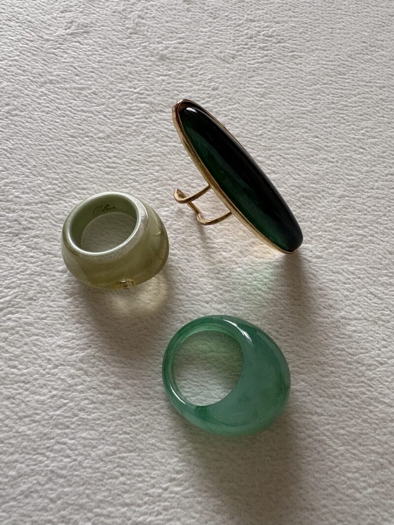 緑の服が多い私は緑のリングは色リンクコーデの必需品。GLADDで見つけたり昔ルミネで買ったものなど。