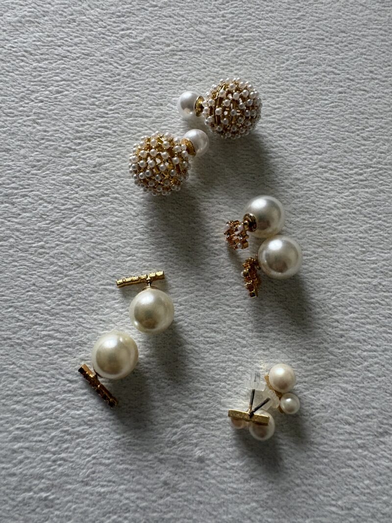 複数のパールが連なっているピアスはひとつでかなり華やかに。