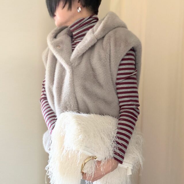バッグもニュアンスカラーの柔らかい色にしたことで、全体が優し気になったかな。