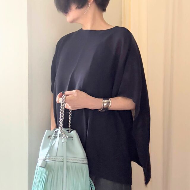 5分丈なので二の腕が全部隠れるのもいいわ~。クロップト丈でバランス取りやすい。