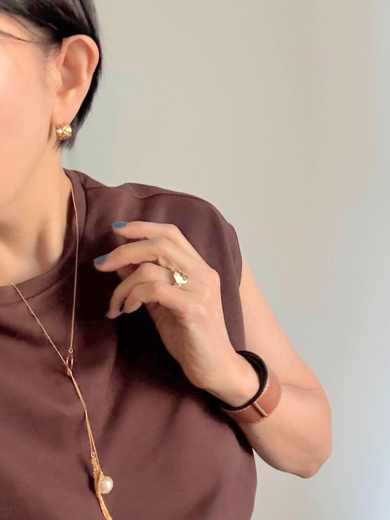 ブラウン色のTシャツって珍しい。見つけた時は即ポチる。こげ茶色、チョコレート色、バーガンディ色が他人からも似合うと言われるし、自分でもそう自覚しているので「茶色」のアイテムを見ると物欲が高まる私。(いつもか・・)