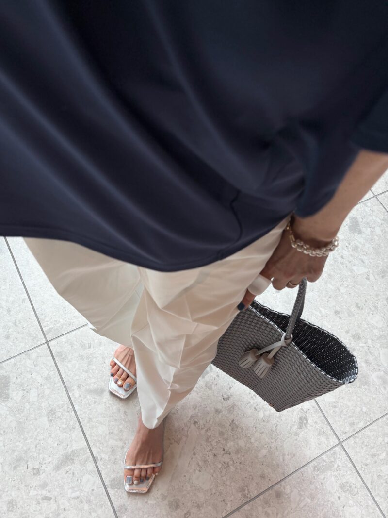 シルバーのメルカドバッグとシルバーのサンダルで色リンク。あとはシンプル目のコーデになった。