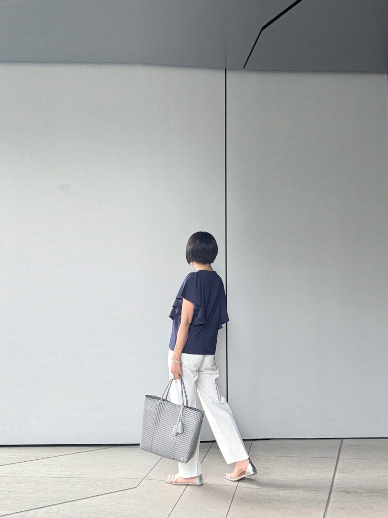 ラッフル袖のおかげで上半身が盛れたかな。身体に張り付かないのでほんと涼しいTシャツ!