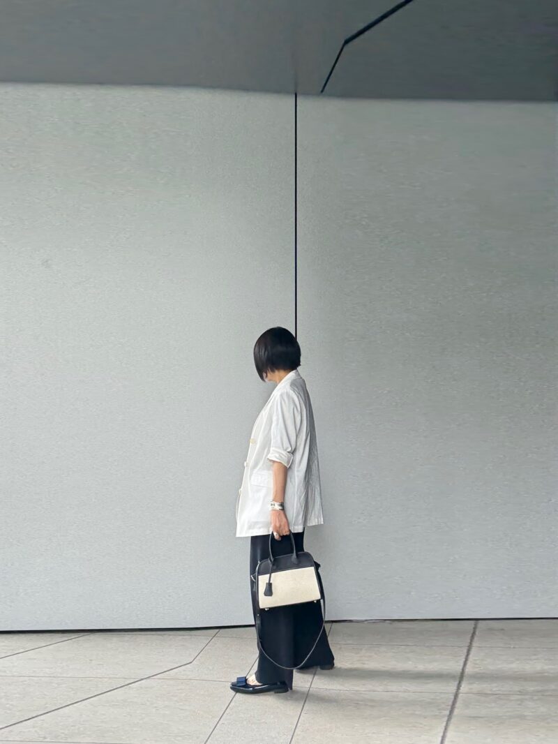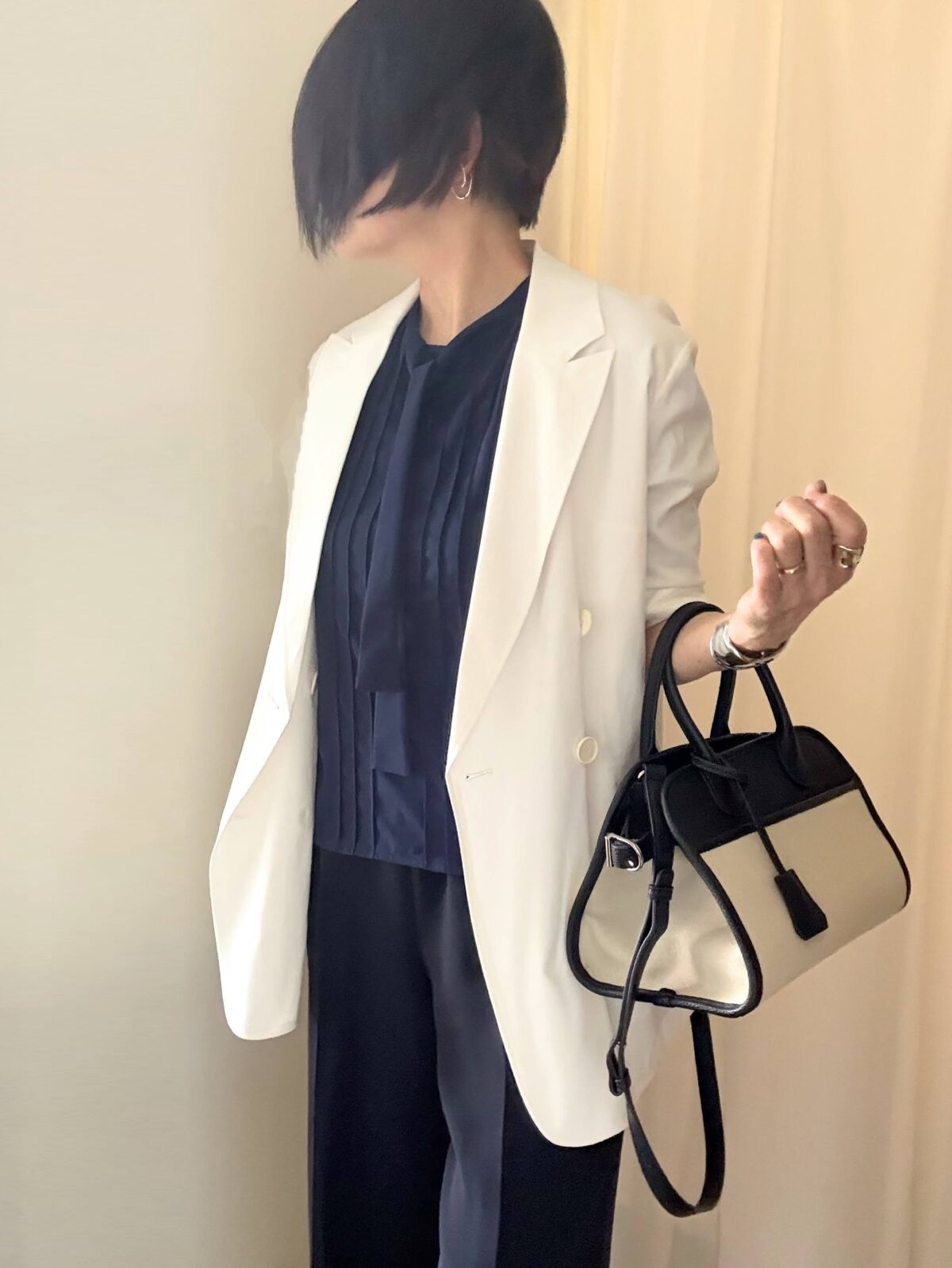 今日は夏物の軽やか白ジャケットで「圧倒的キリリ感」を出してるけど、実は中に着たTOPSがこの上なく楽なTops。