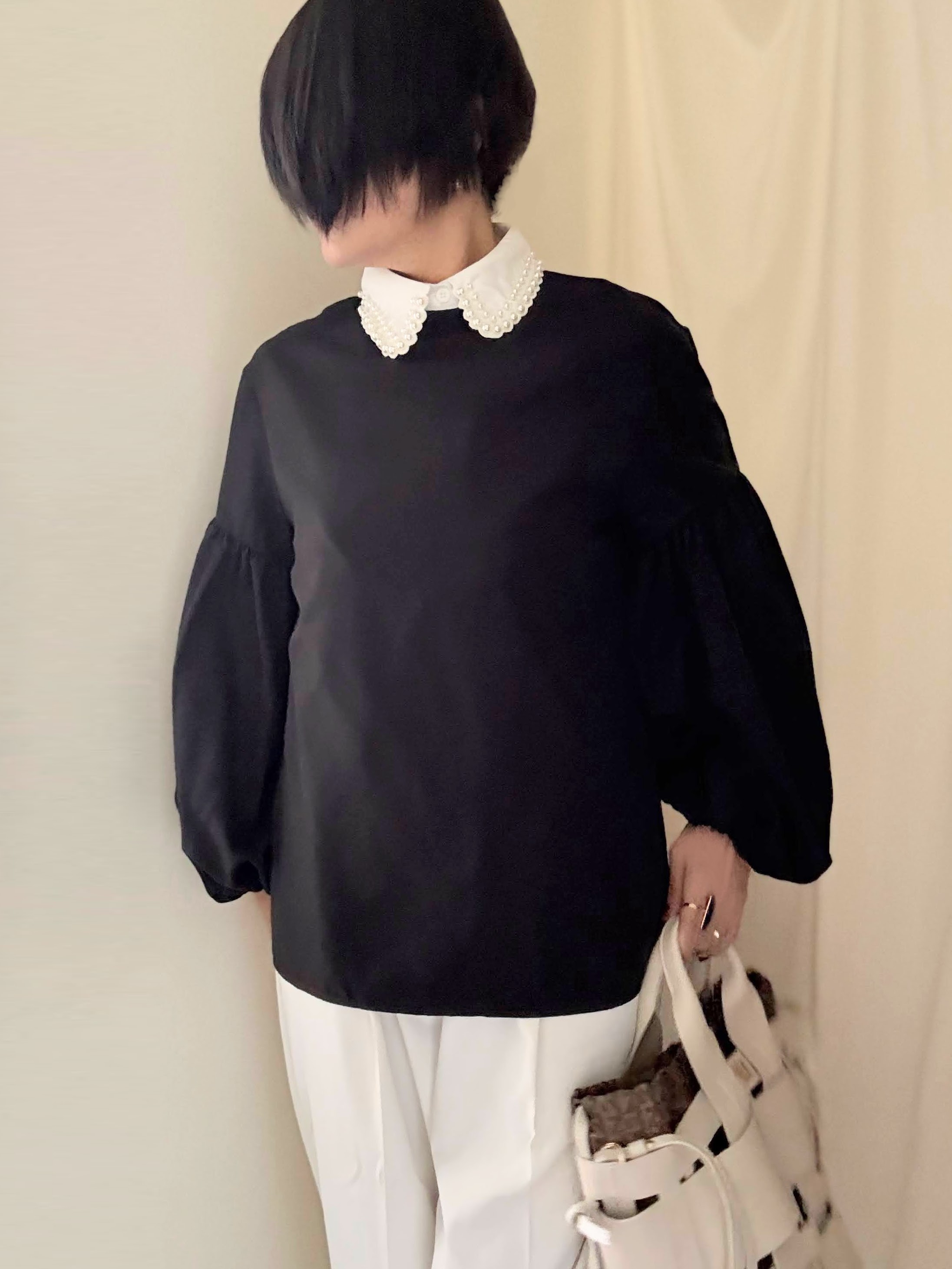 ポワン袖でボウタイブラウスにすると女らしいコーデになるなー!