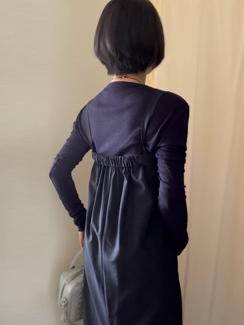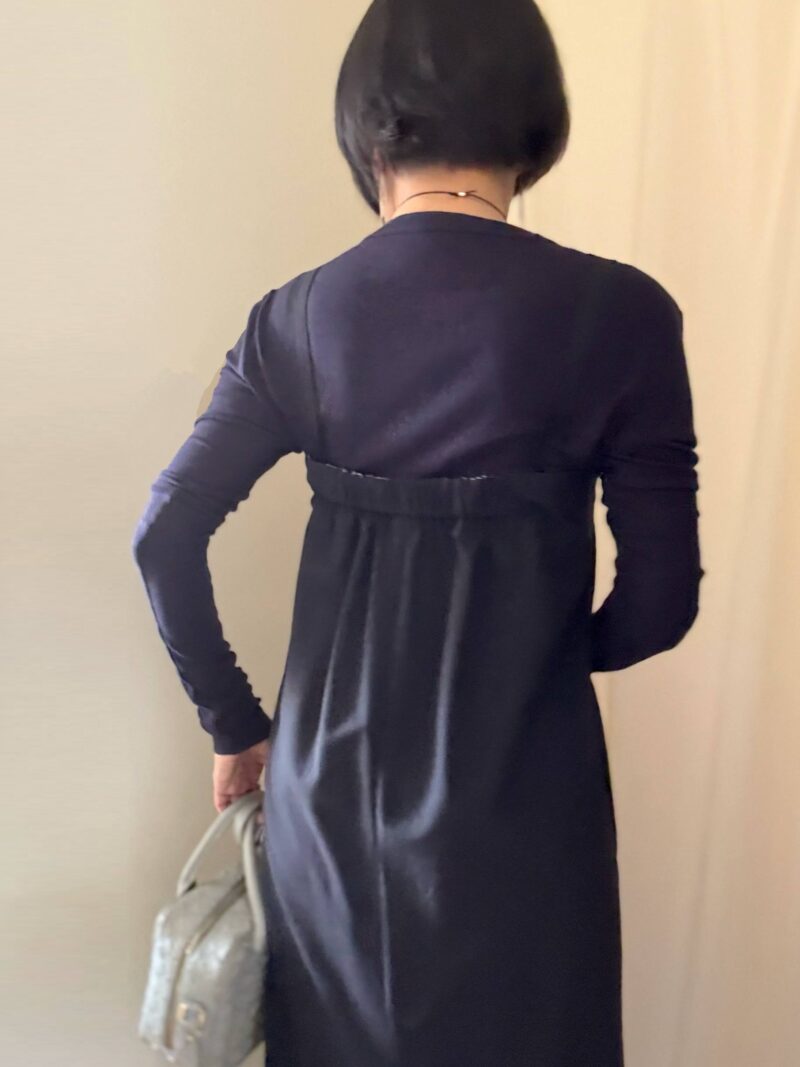 私が着てるのはネイビー。黒に近いネイビーで上品な色。