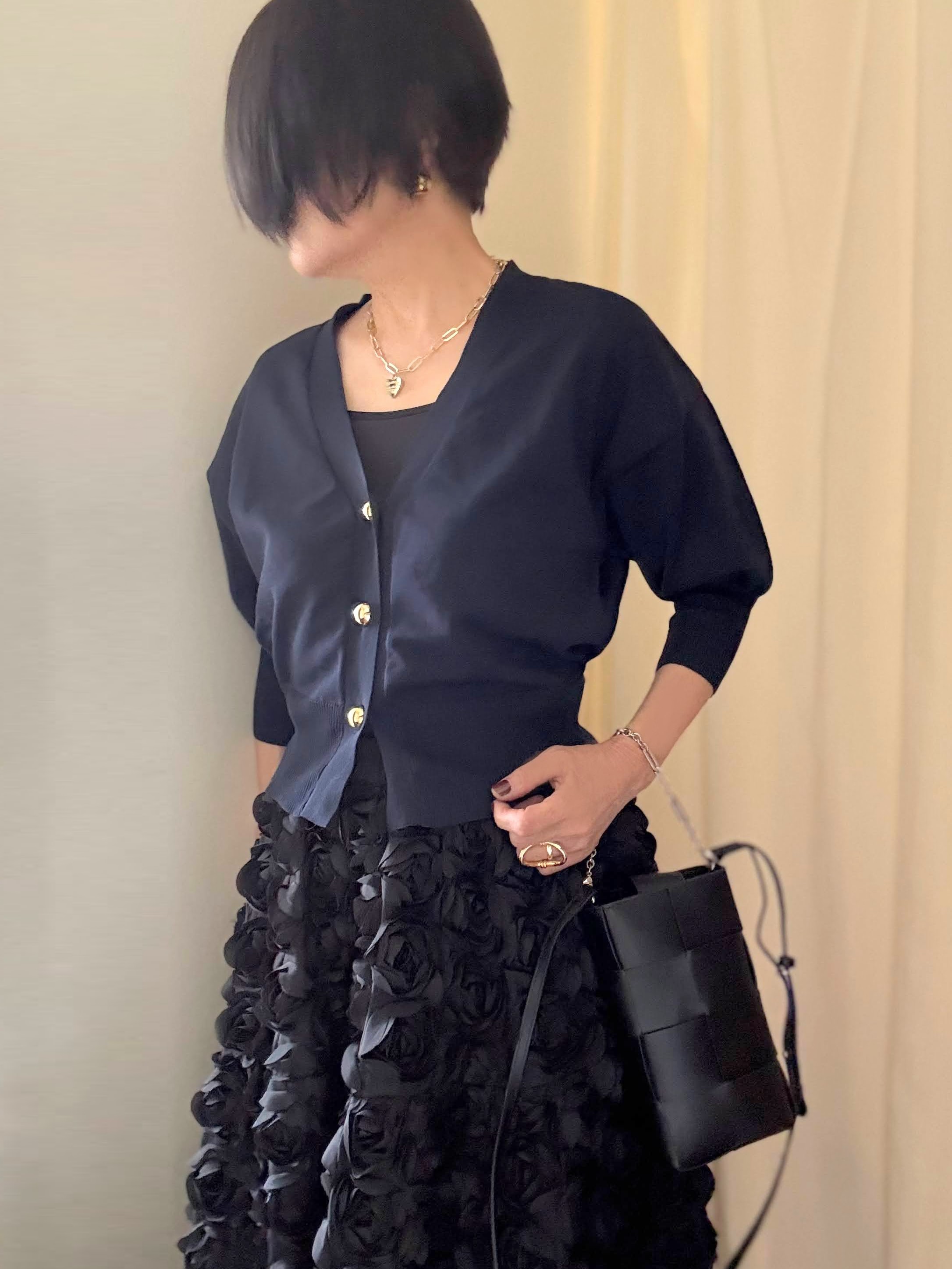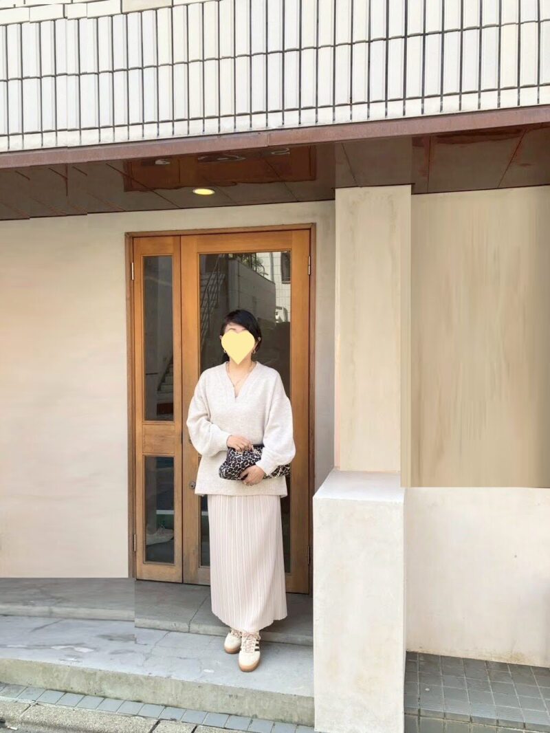 結構ゆるめのシルエットなのでこのニット、ボトムスはタイトスカートかスリム系パンツが良さげ!