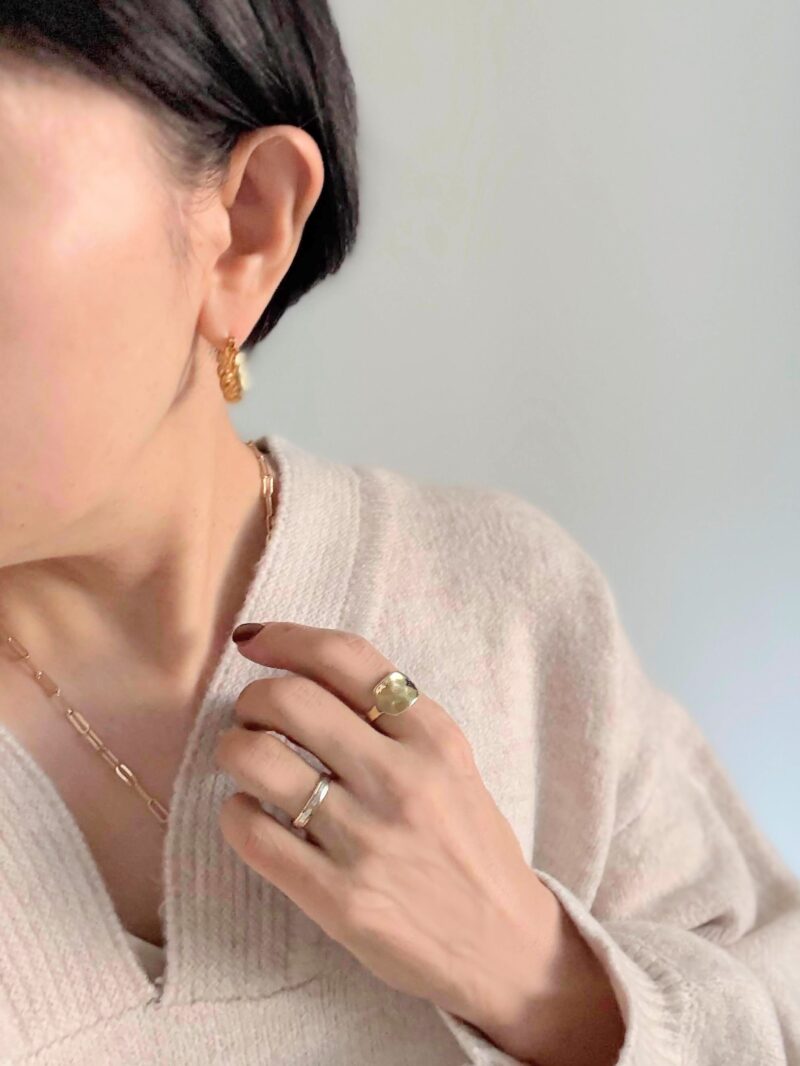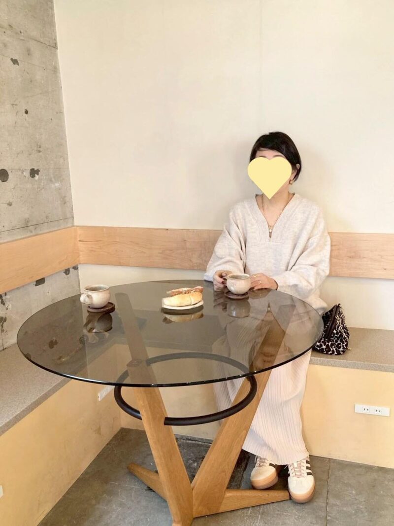 袖も裾のリブもギュッと締め付けない、全体的にゆったりしたニット。優しい気分になりたい休日のコーデにぴったり。