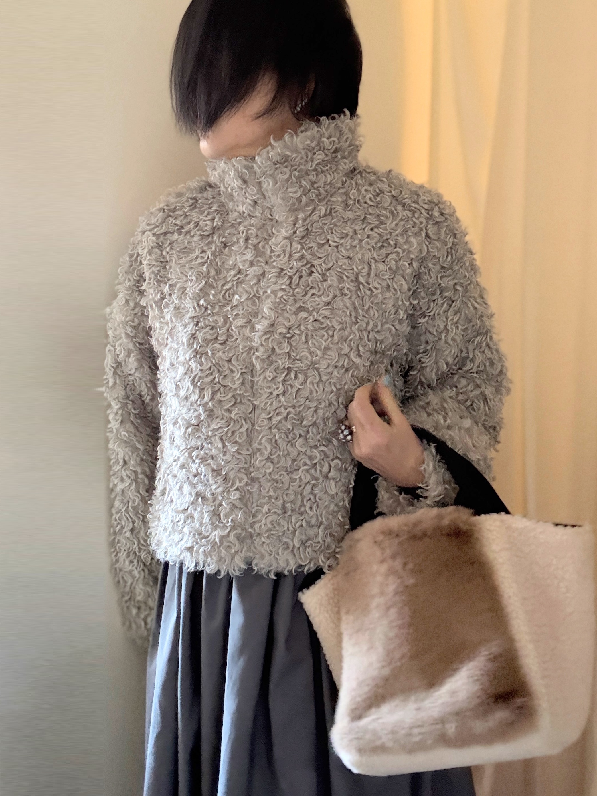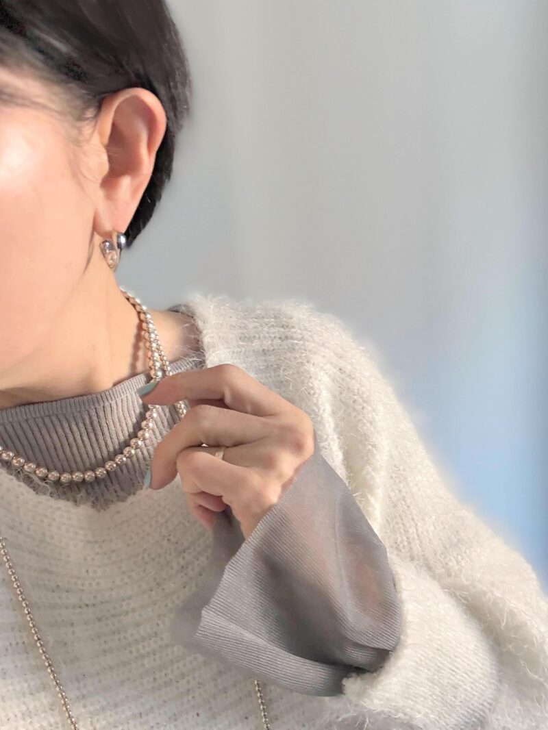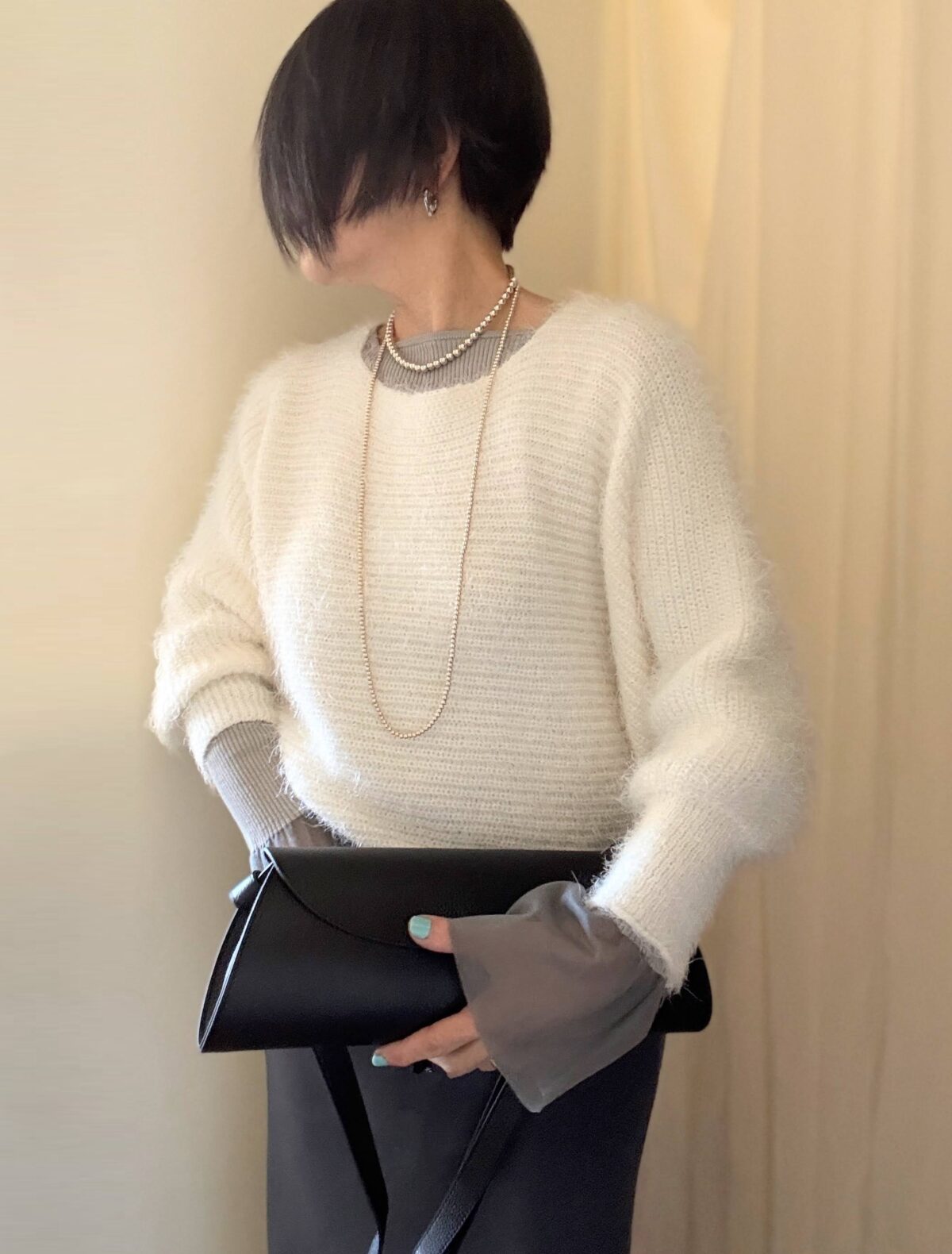襟ぐりが綺麗で気に入っているモフモフなモヘアニット。今日はこれの下にチュール袖がほどこされたグレーのカットソーをレイヤード。