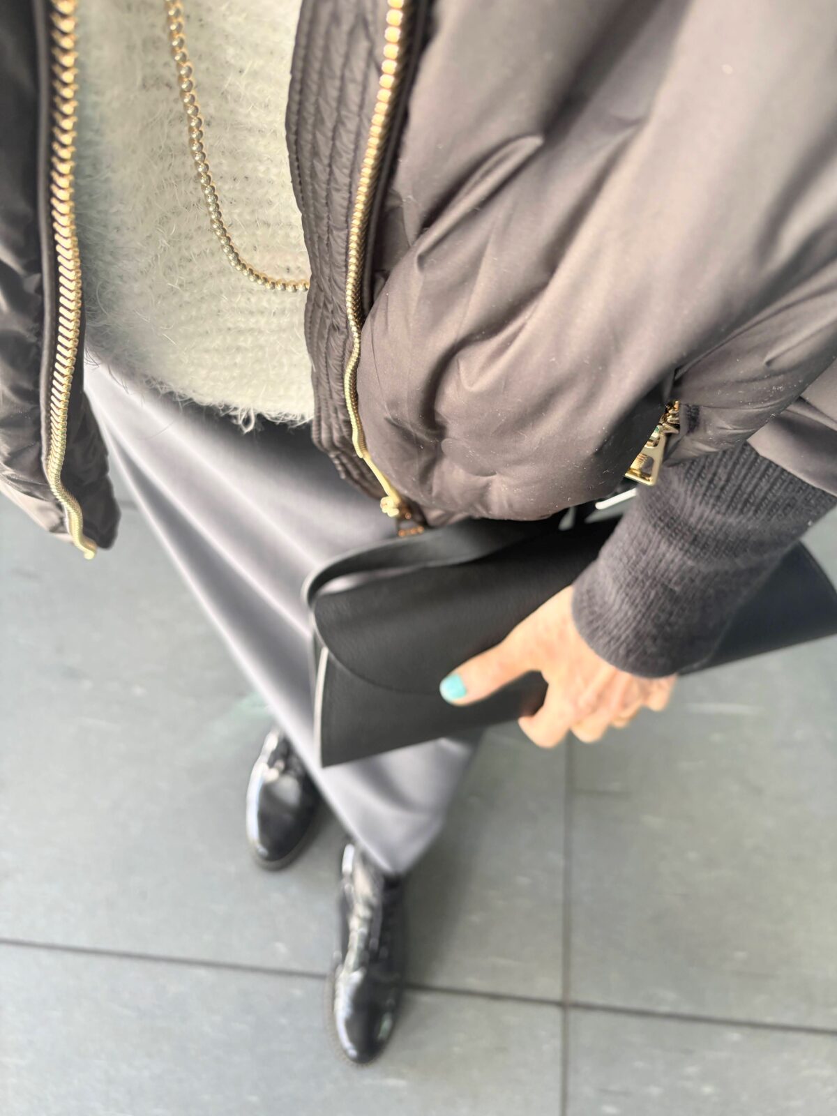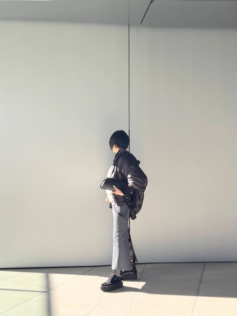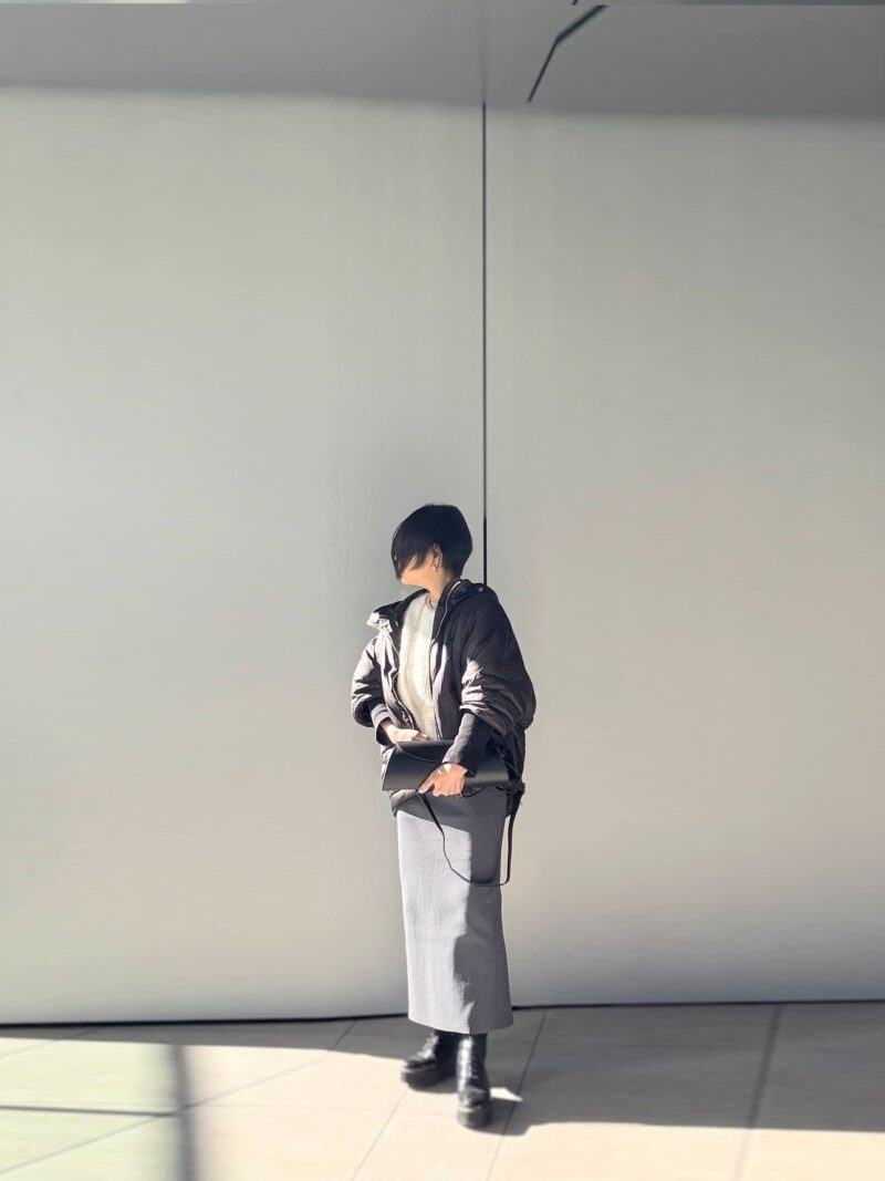 全体。ボトムスはボンジュールサガンのニットタイトマキシ。潔いこの長さが好き。