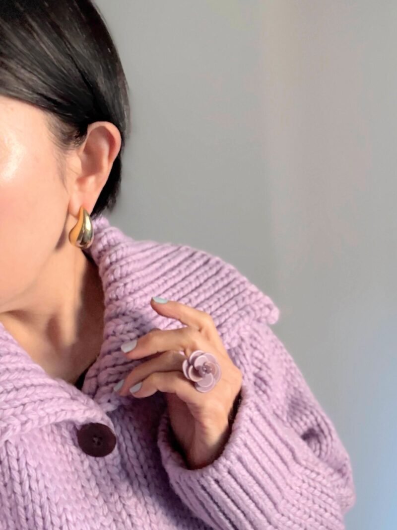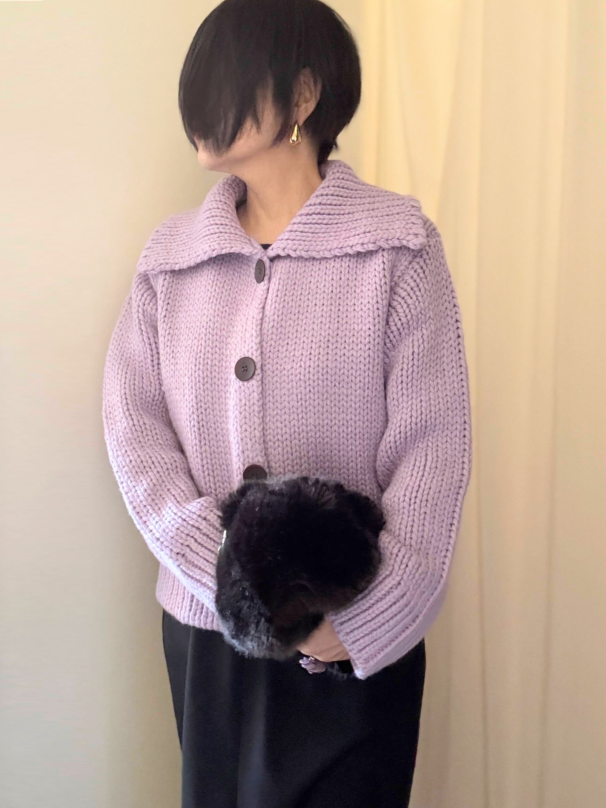 明るい気分になるラベンダー色の厚地のニットジャケット。カーディガンというか。