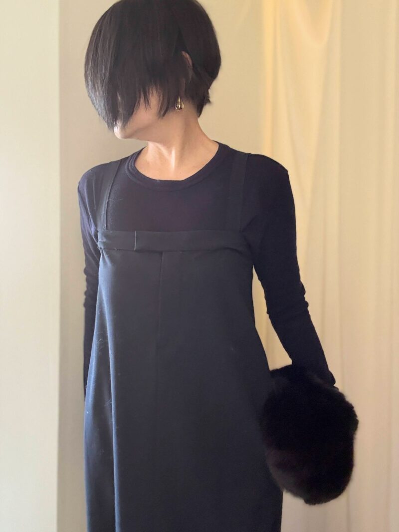 胸元まである吊りのジャンパースカート。ウエストが楽なのと、TOPSの丈感に悩まなくていいのでコーデが激楽なのよ。背中はゴムシャーリングなので締め付け感無くフィットするのもGOOD。