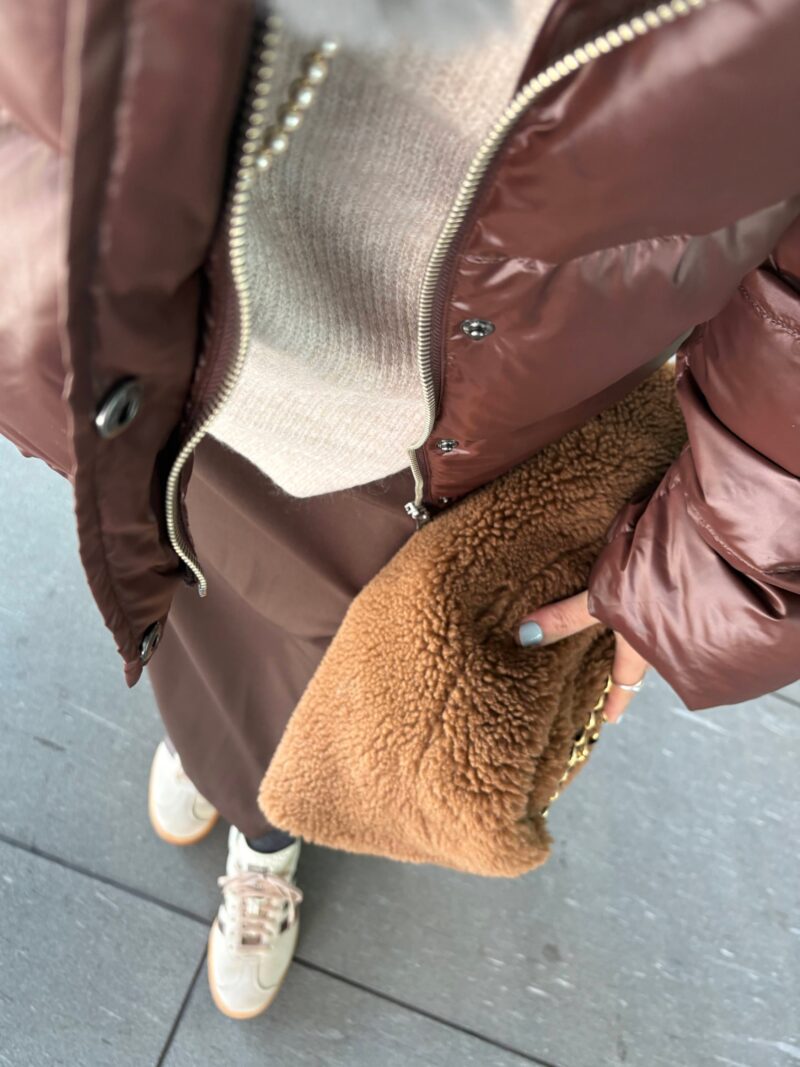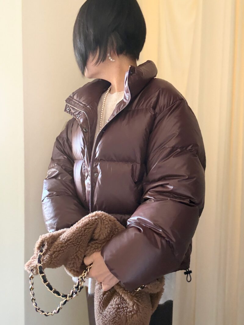 そでがポワン。丈はお尻が隠れるくらい。ボア素材のヴィオラドーロのbagで。