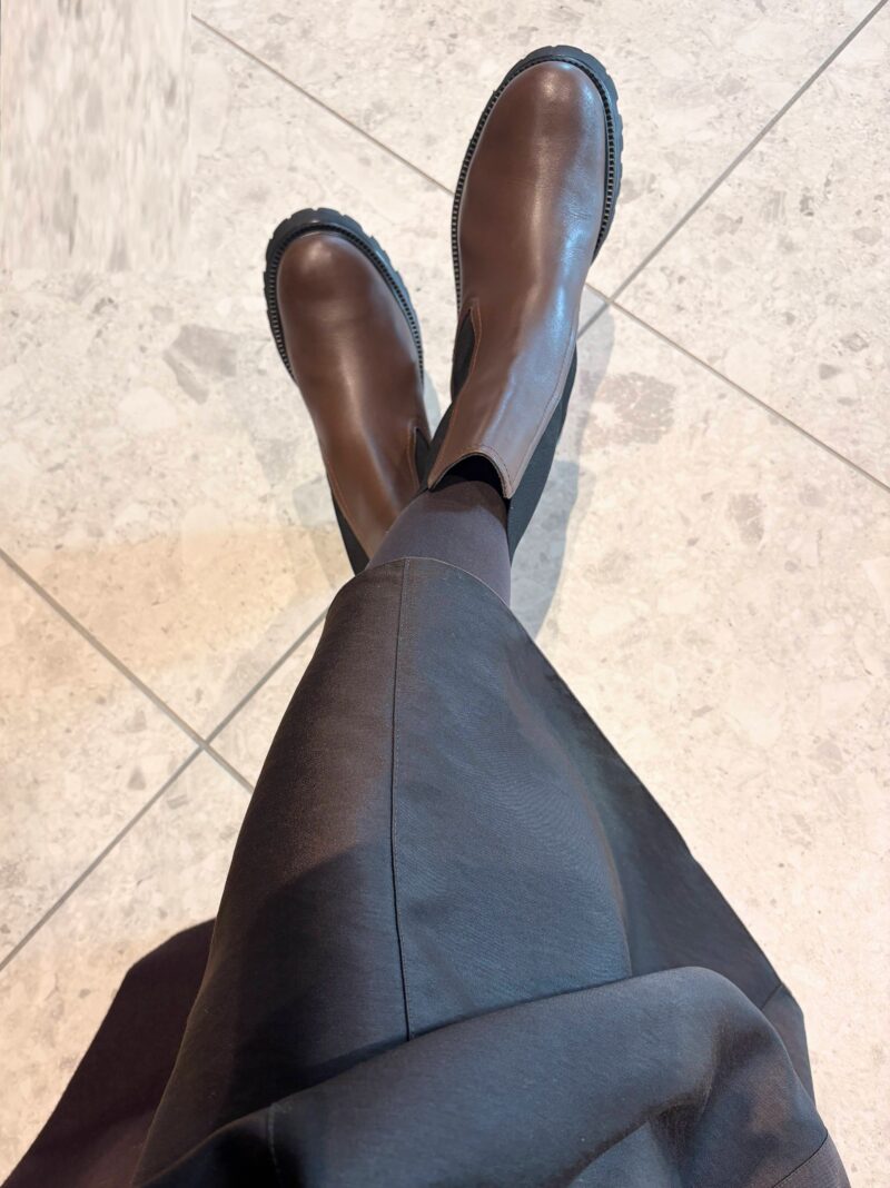 足首までしっかり長さがあってグー。このAラインのシルエットのスカートって、今、中途半端な丈感だとダメ。古臭い感じになるので。
