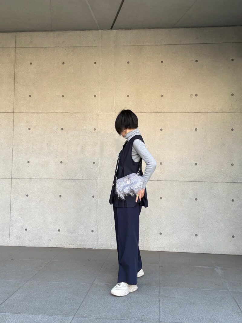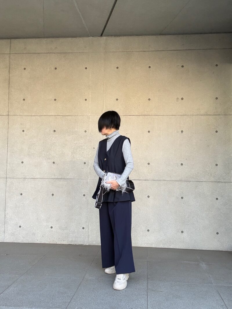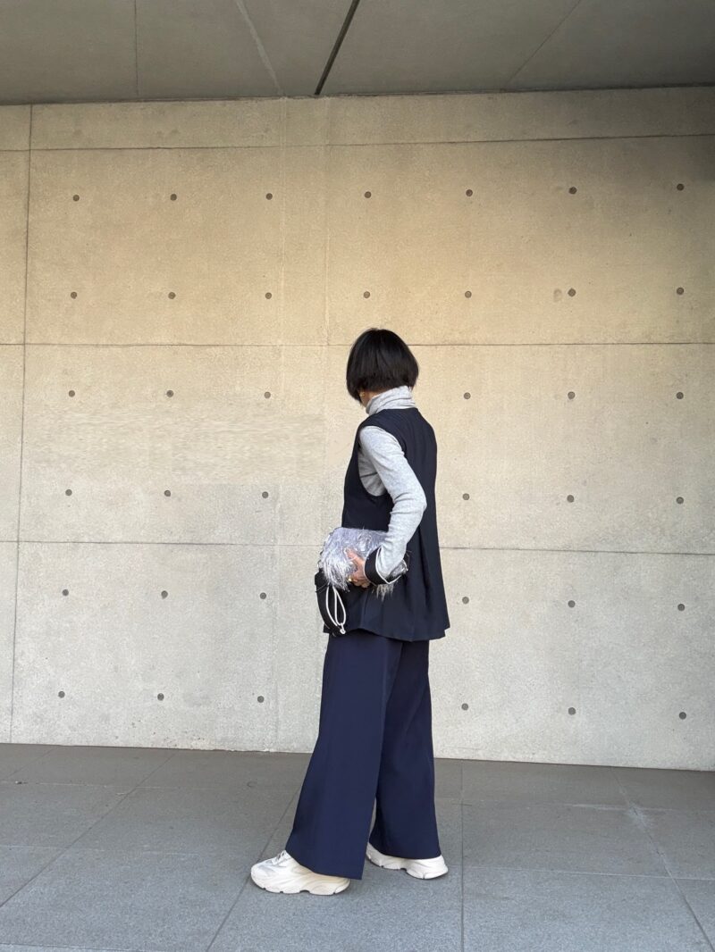 この手のコーデ、昔はパンプスやフラットシューズを当然のように合わせていたけど今はゴツメのスニーカーが気分。特にパンツがワイドならスニーカーは華奢なものでなくて敢えて「ゴツメ」が今っぽい。