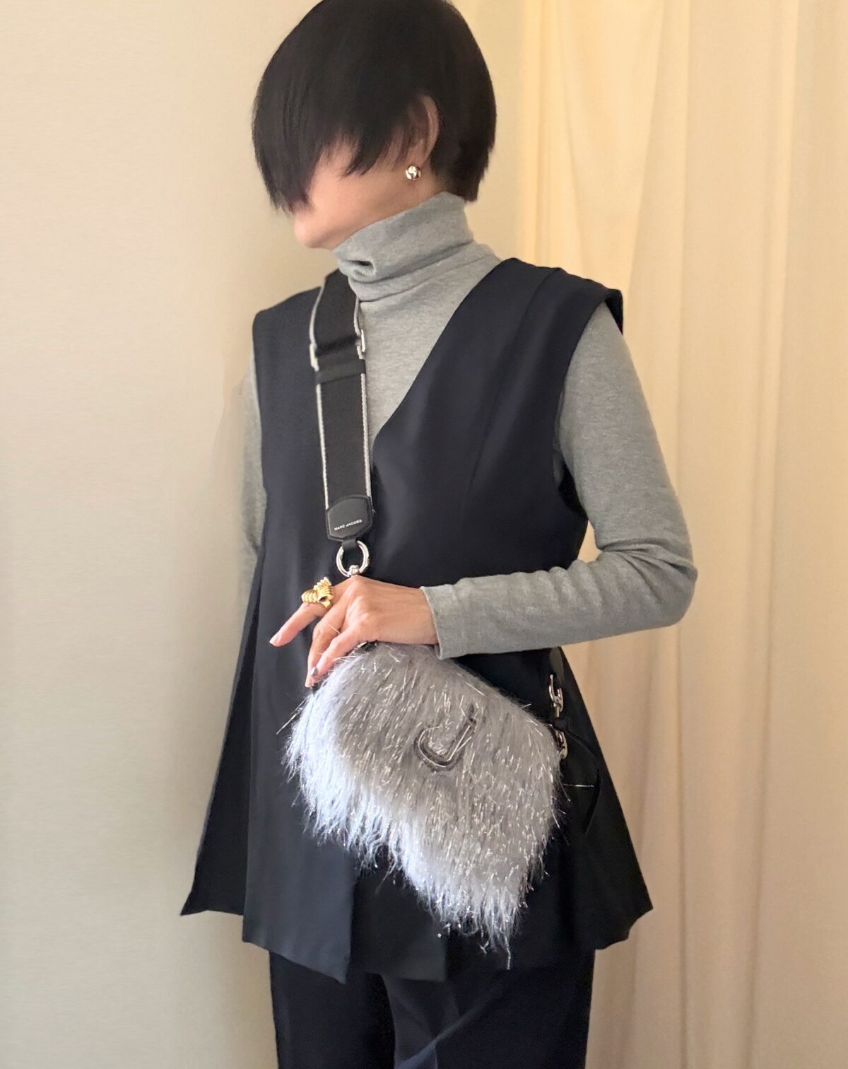 今回のは横長のスクエアな形が納まりがよくてカッコイイの。正直沢山モノが入るか?と言われればNOだけど、もはやアクセサリーとして持ちたいバッグ。スマホや鍵など最小限のものは入る。