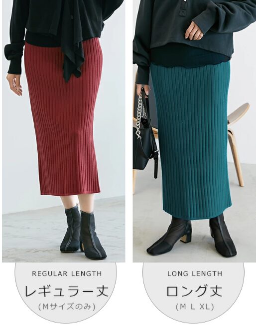 ・ニットタイトスカート:-3kg着痩せる ニットスカート リブニット 前後2WAY ウエストゴム 極暖