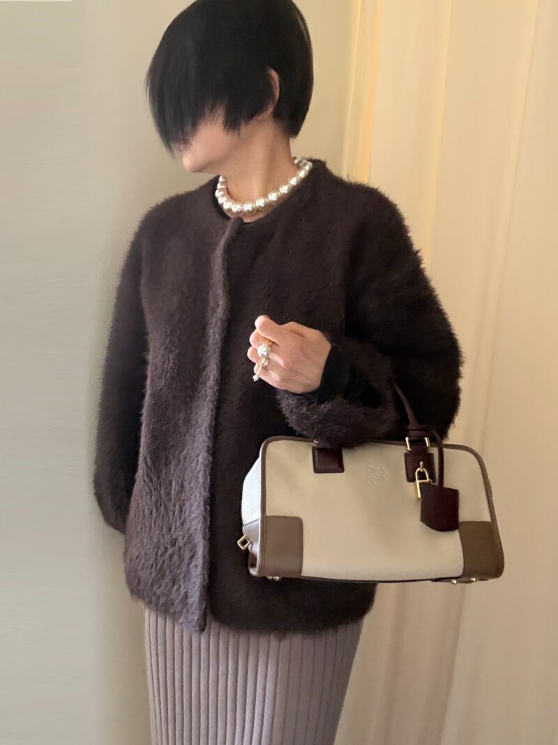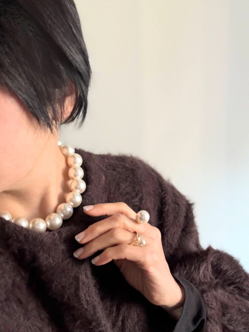 丸首が詰まり具合がキレイなニットジャケット。これにはこの大粒パールのネックレスがぴったり。