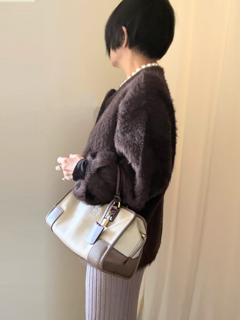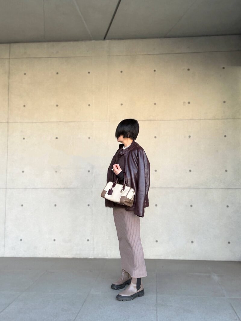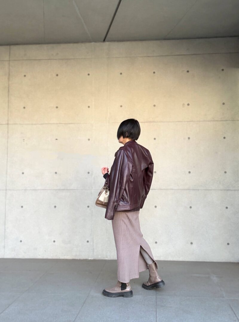 バッグは「色で」選んだ。革ジャケットのボルドー色とこのLOEWEのアマゾナ、色が完璧にリンクする。