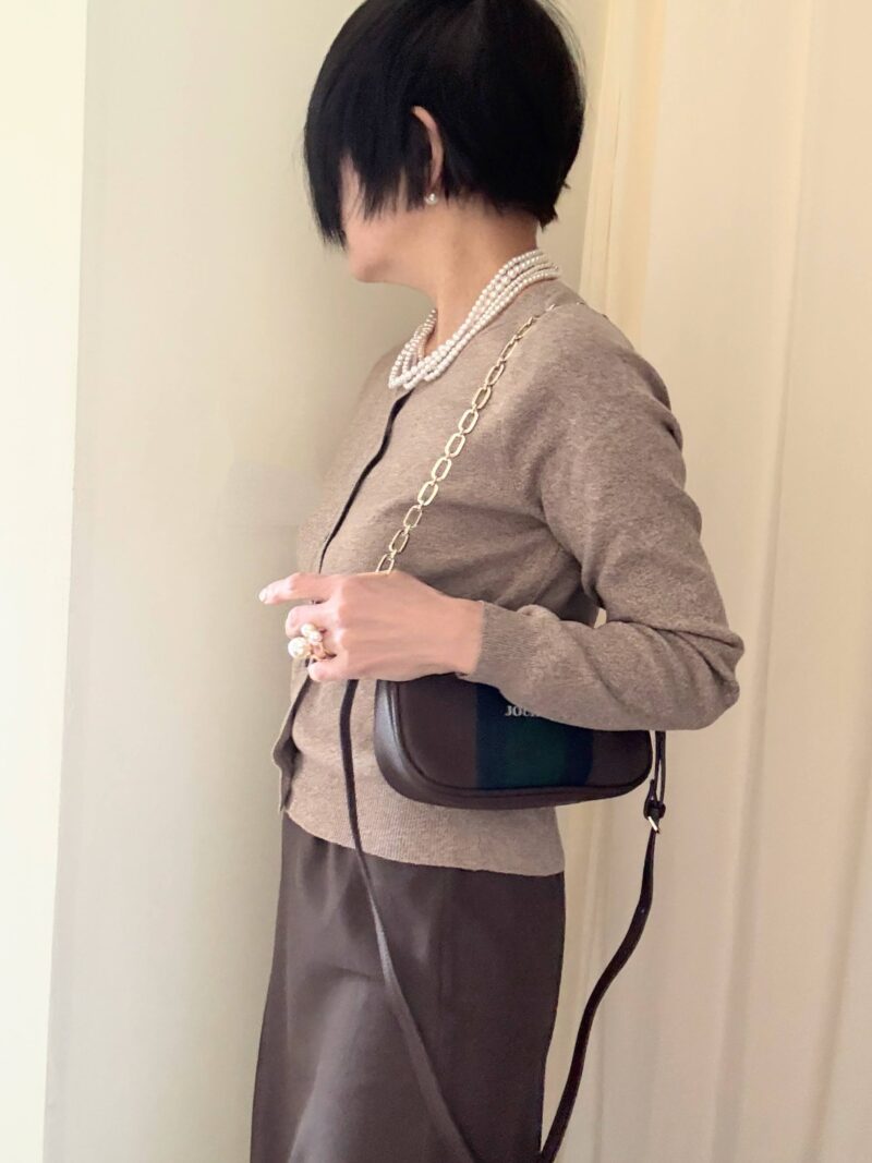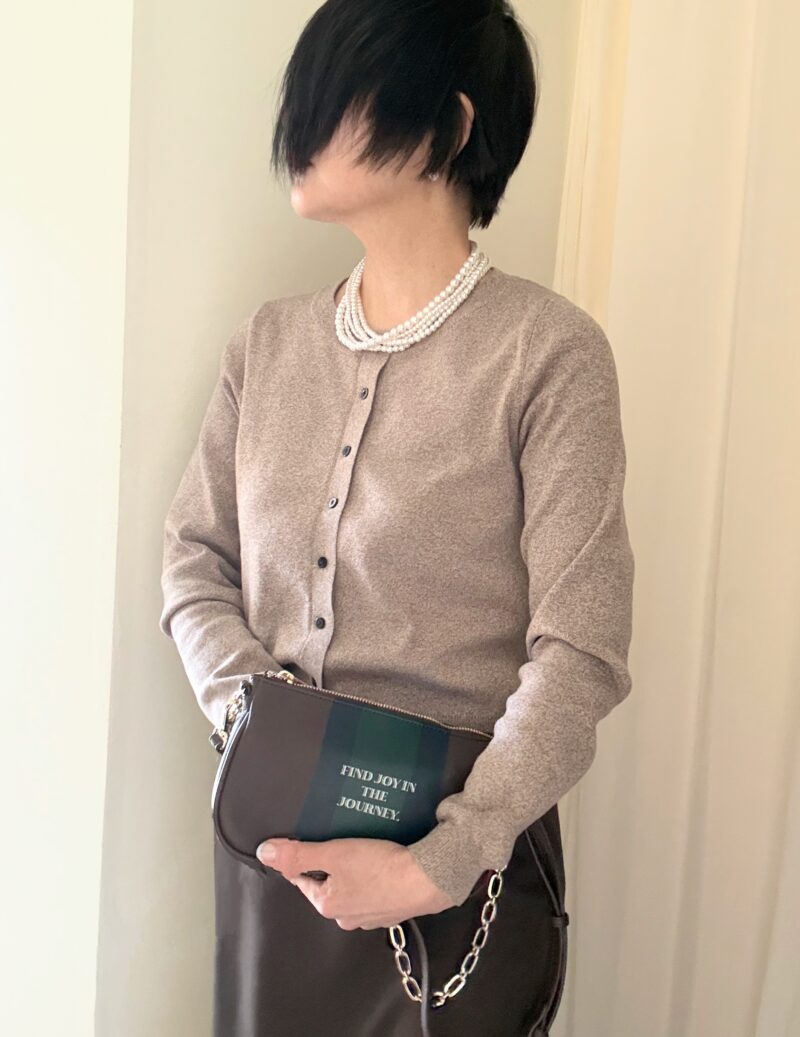 ニットカーディガン、コレも今期活躍してる。これはボンジュールサガンのもの。