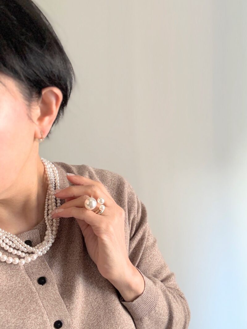 今日はパールに合わせて指輪もパールで。これ三位一体(?)の指輪なの。重ね付けしなくてもこのボリュームさ。便利じゃない?