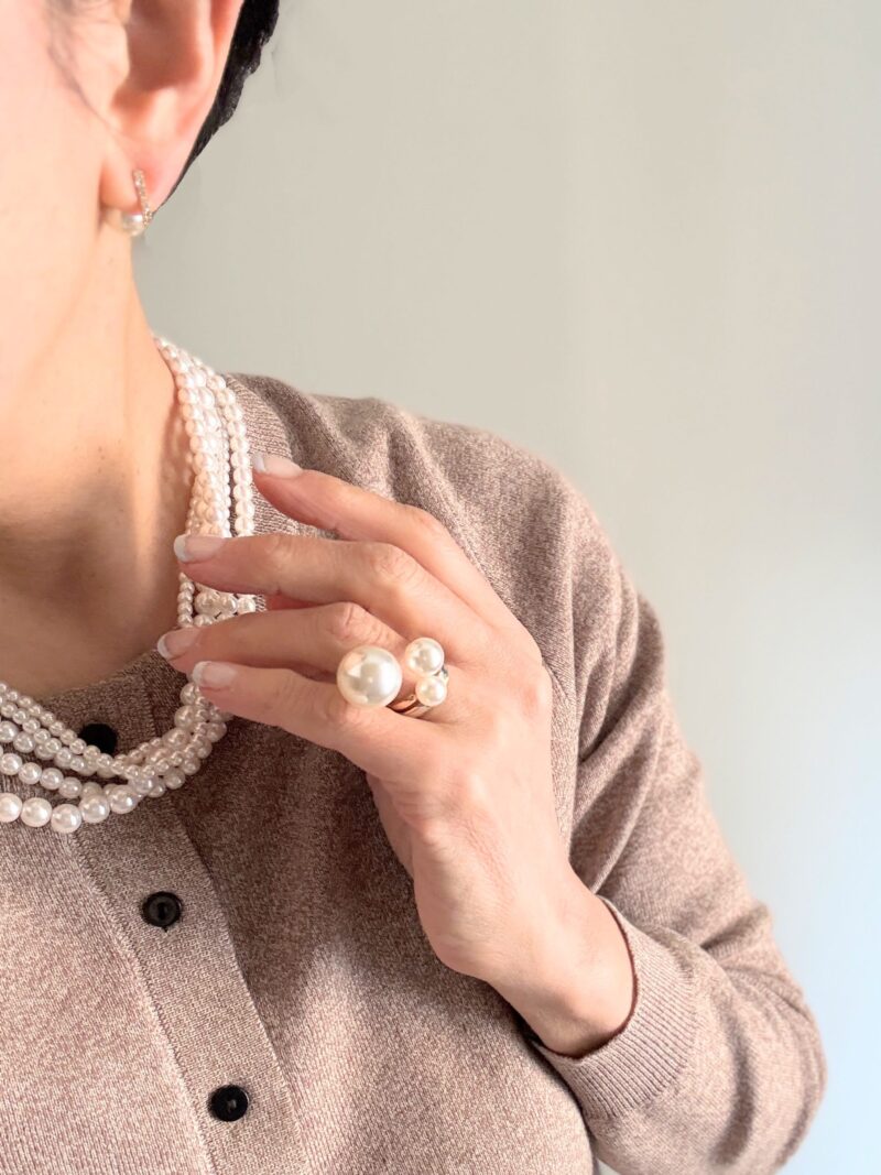 このショートの多連パールネックレスは留め金がひっかけやすくて朝ラクチン。大小粒の大きさも異なるのでゴージャスだけど抜け感。