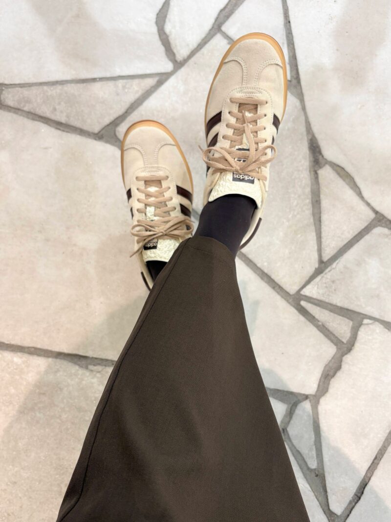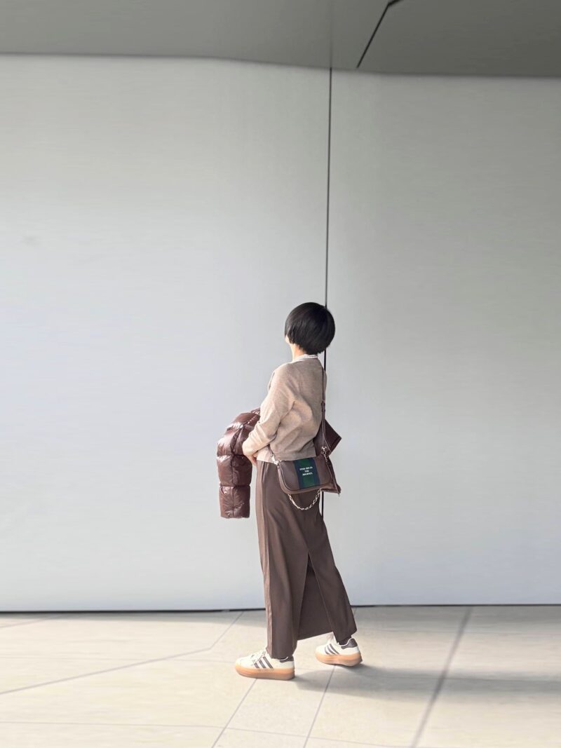 手元にガツンとほしい時にこれは使える!足元はこげ茶のタイツ+スニーカーで。徐々にブーツが暑苦しくなってきましたね。