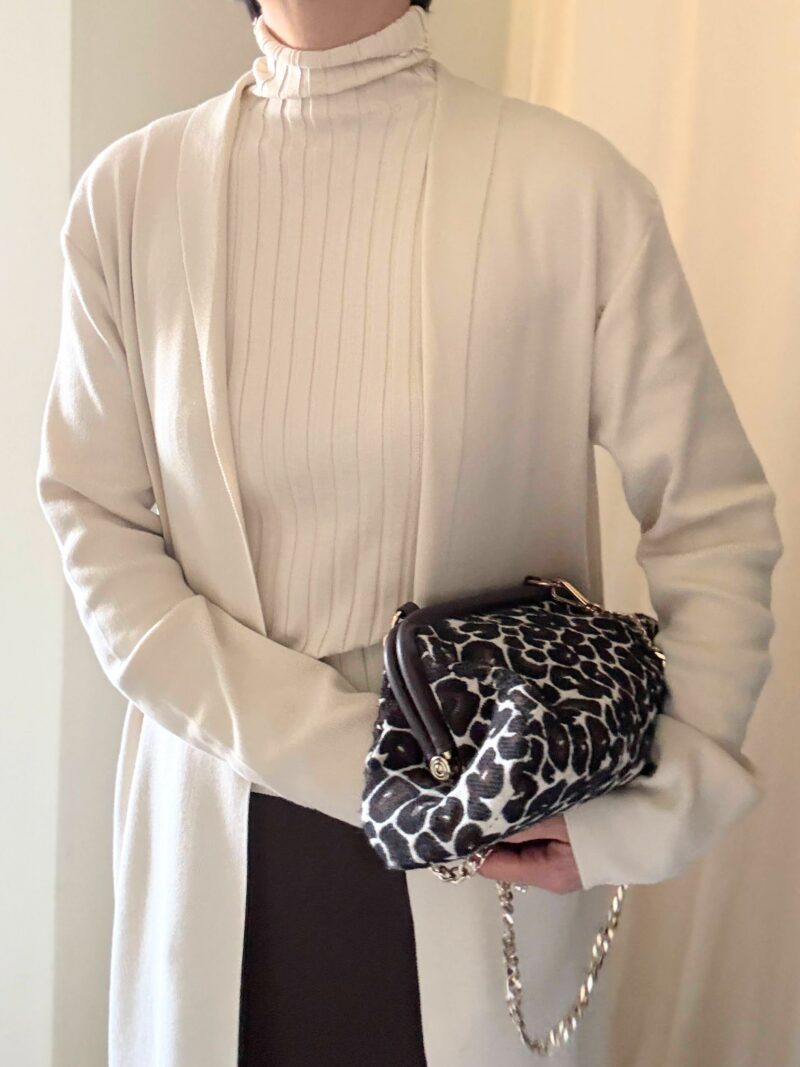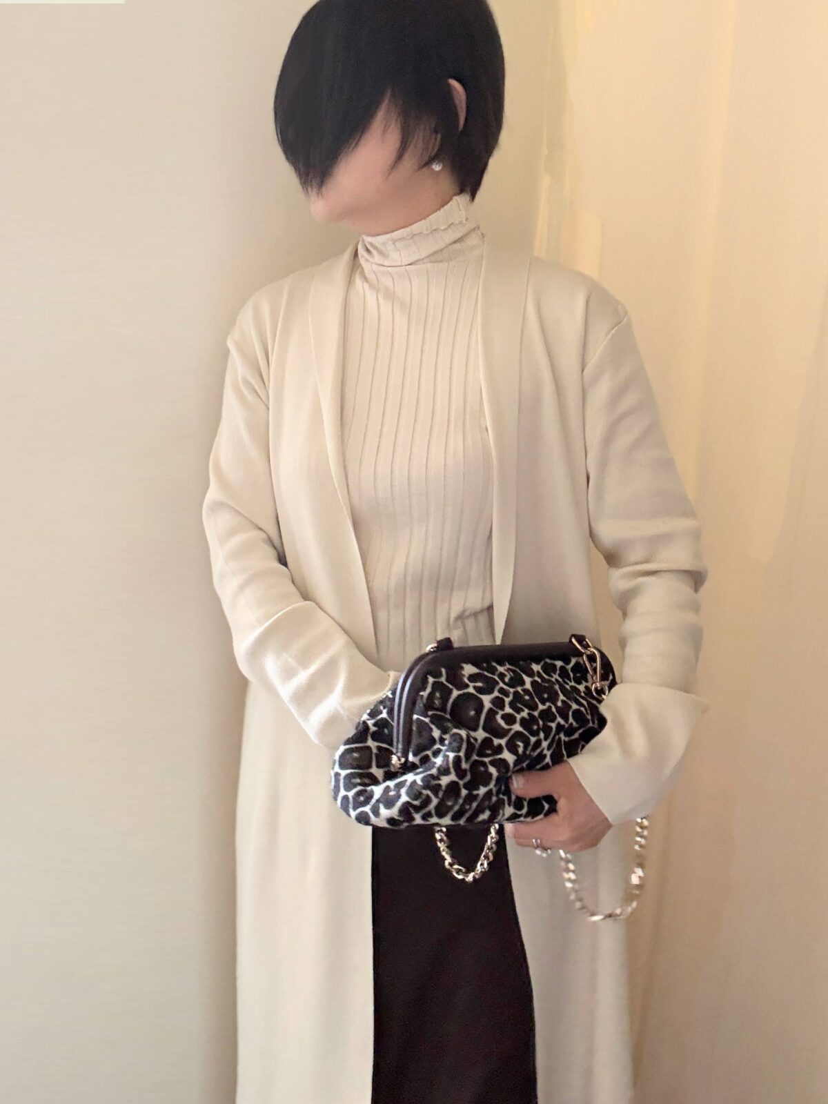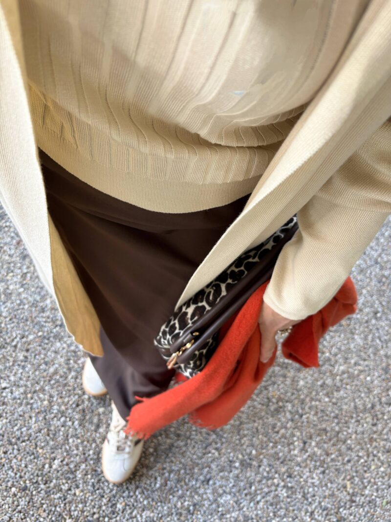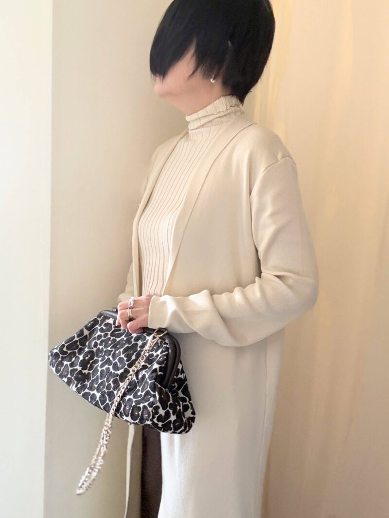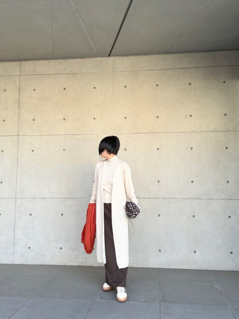 このロングカーディガンの下はワイドパンツか、今日のようにマキシ丈のタイトスカートが合う。中途半端な丈のスカートはNG。