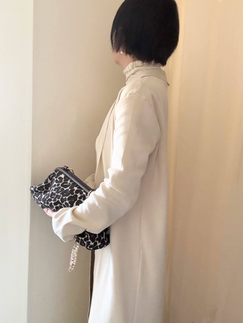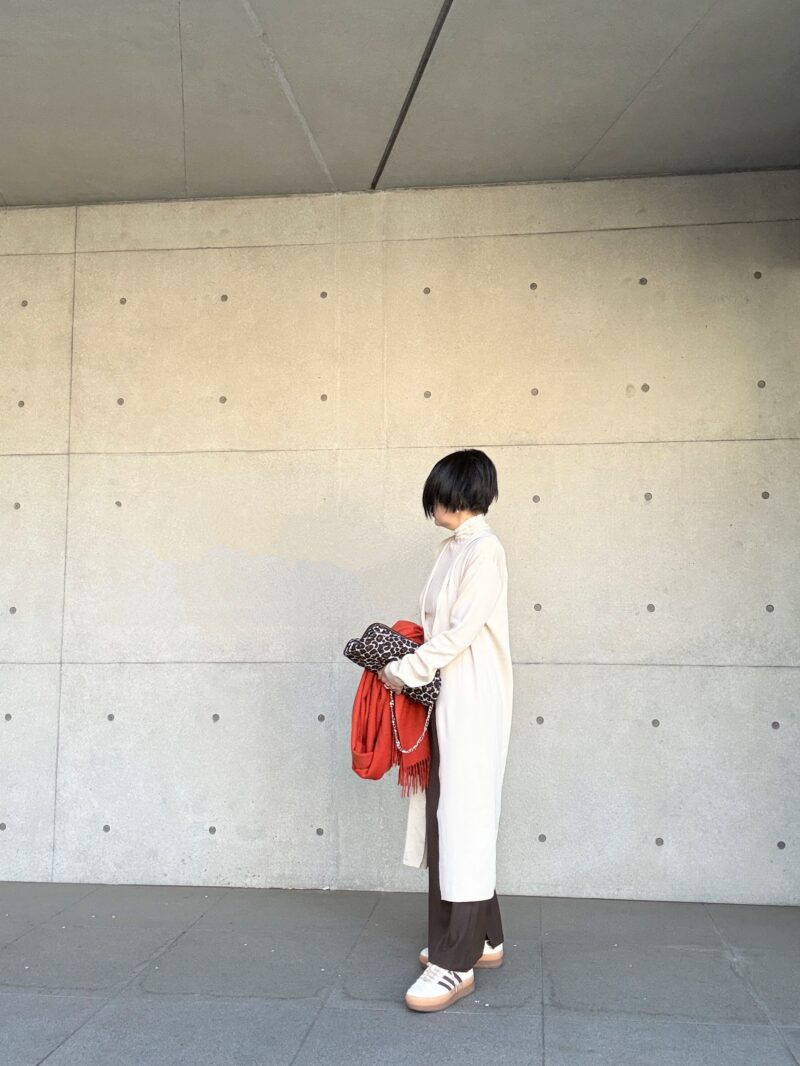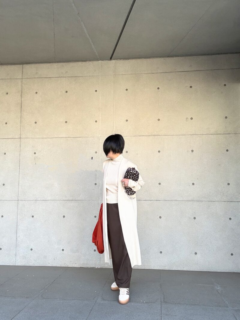 袖もやや長め。そしてこのセットアップ、ロングカーディガンの潔い長さが良いの。