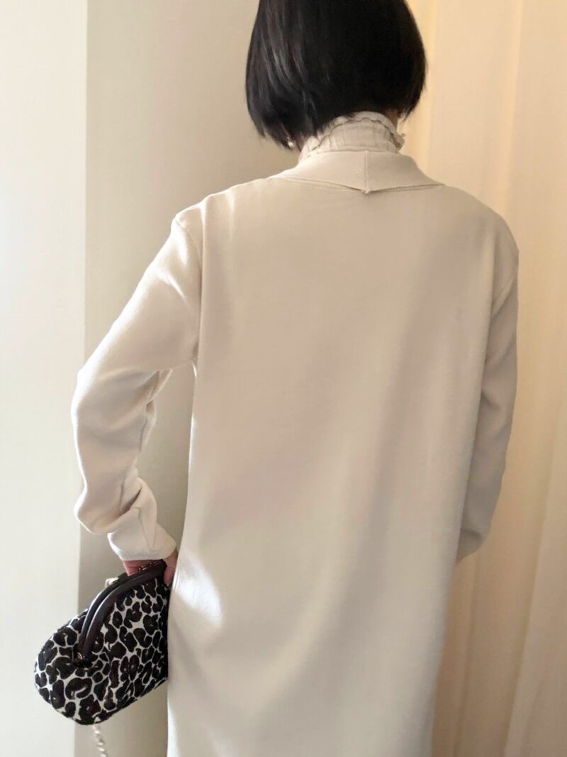 全体。ひざ下まで来るカーディガンの長さに注目。