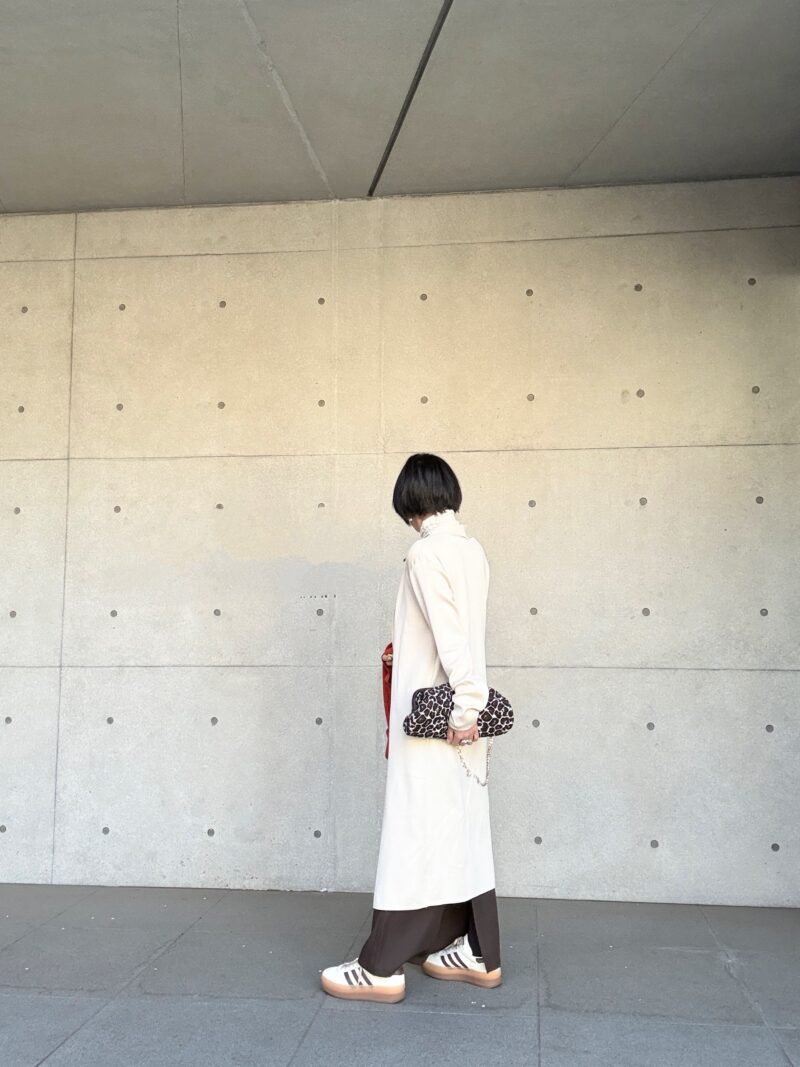 私はバラバラに他の服とも合わせやすいようにアイボリーをチョイスしたけど、3点セットフルで着るのならグレージュ色が着やすいかと。シックでエレガントじゃない?ニュアンスカラーコーデ。
