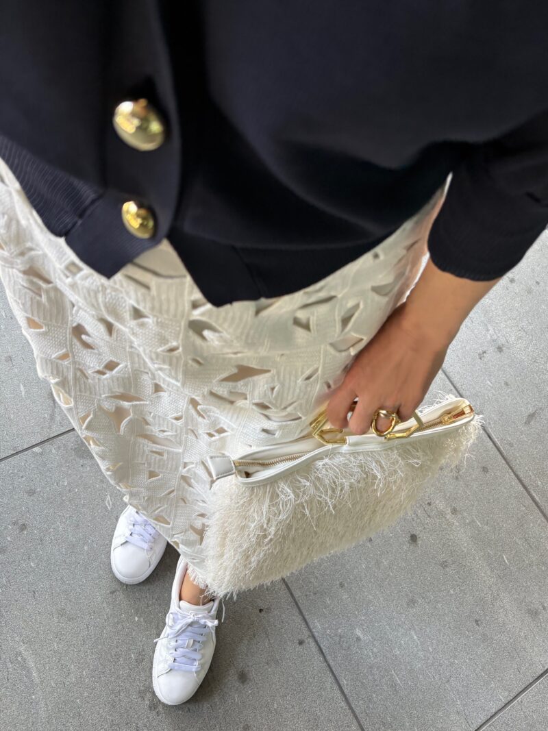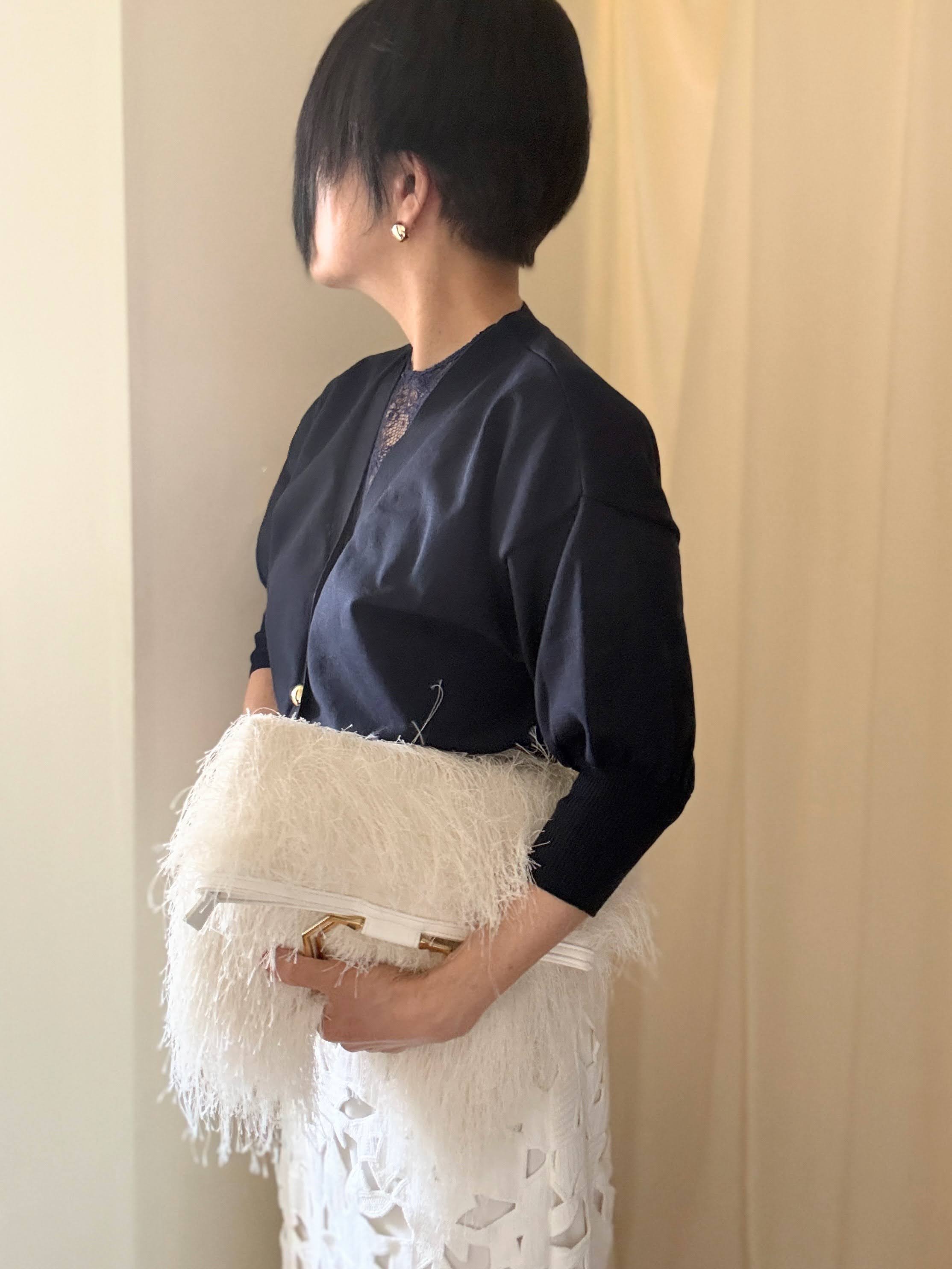レースのインナーにカットワーク刺繍のスカート、シャギーなbag。個性つよつよなアイテムが集合してしまってどうなるかと案じたが、