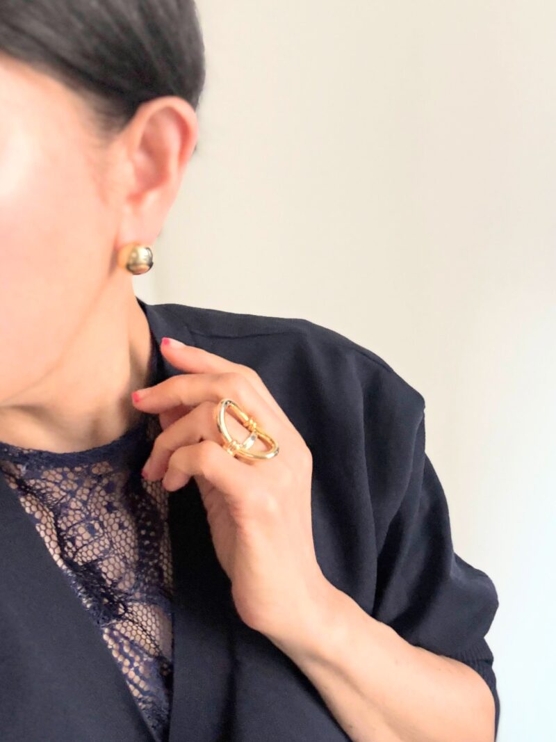 アクセサリー。カーディガンのボタンがGOLDのコロンとした丸だったのでそれをリピートしてピアスにも。