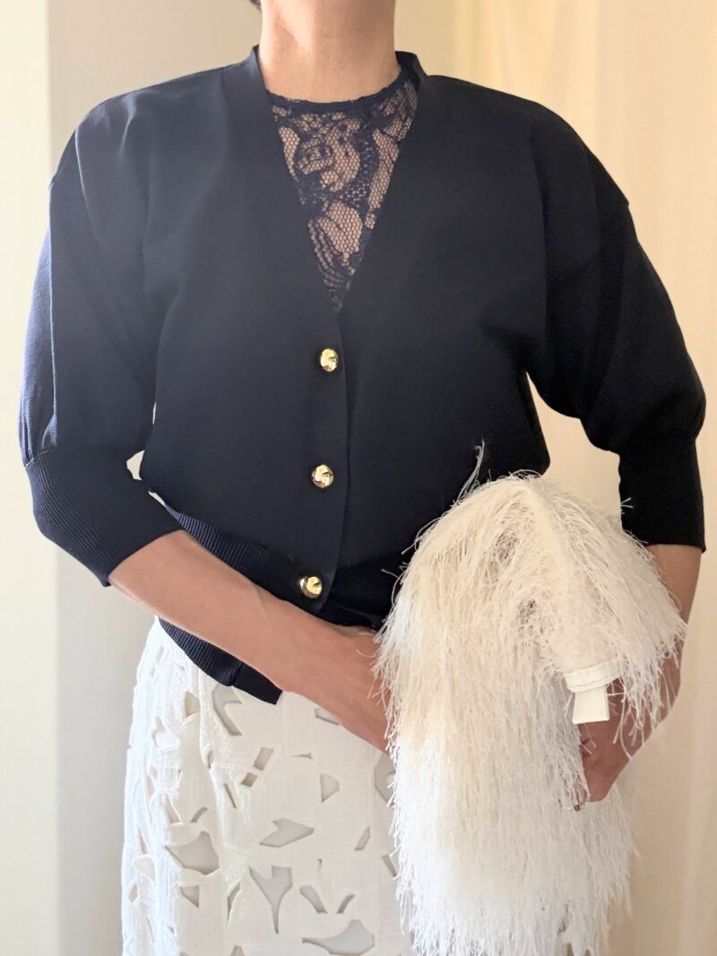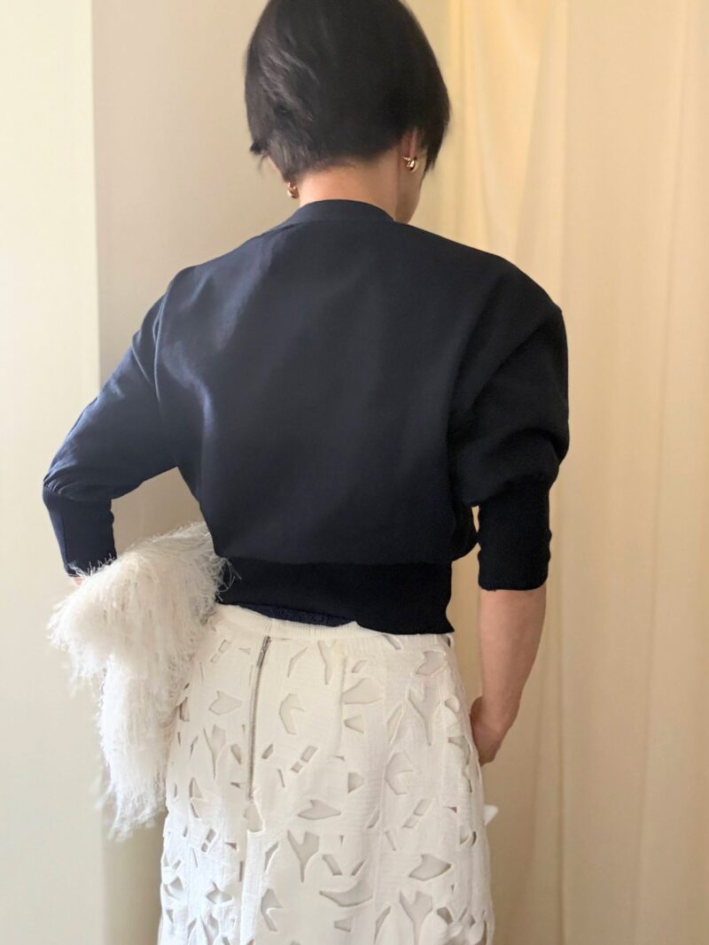 今日は七分丈が珍しいショートなカーディガンニット。V字ネックの空き部分にレースのインナーを仕込む。