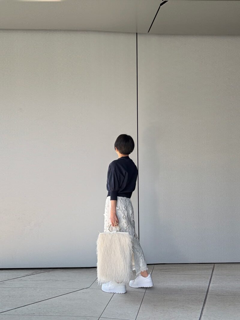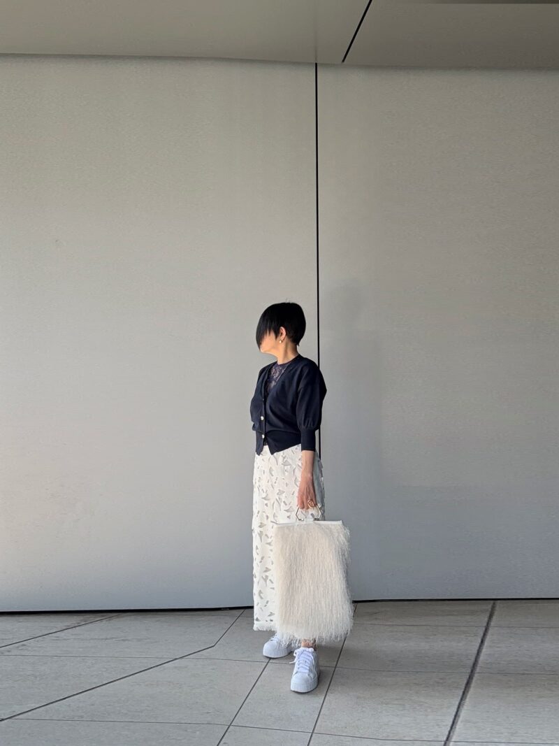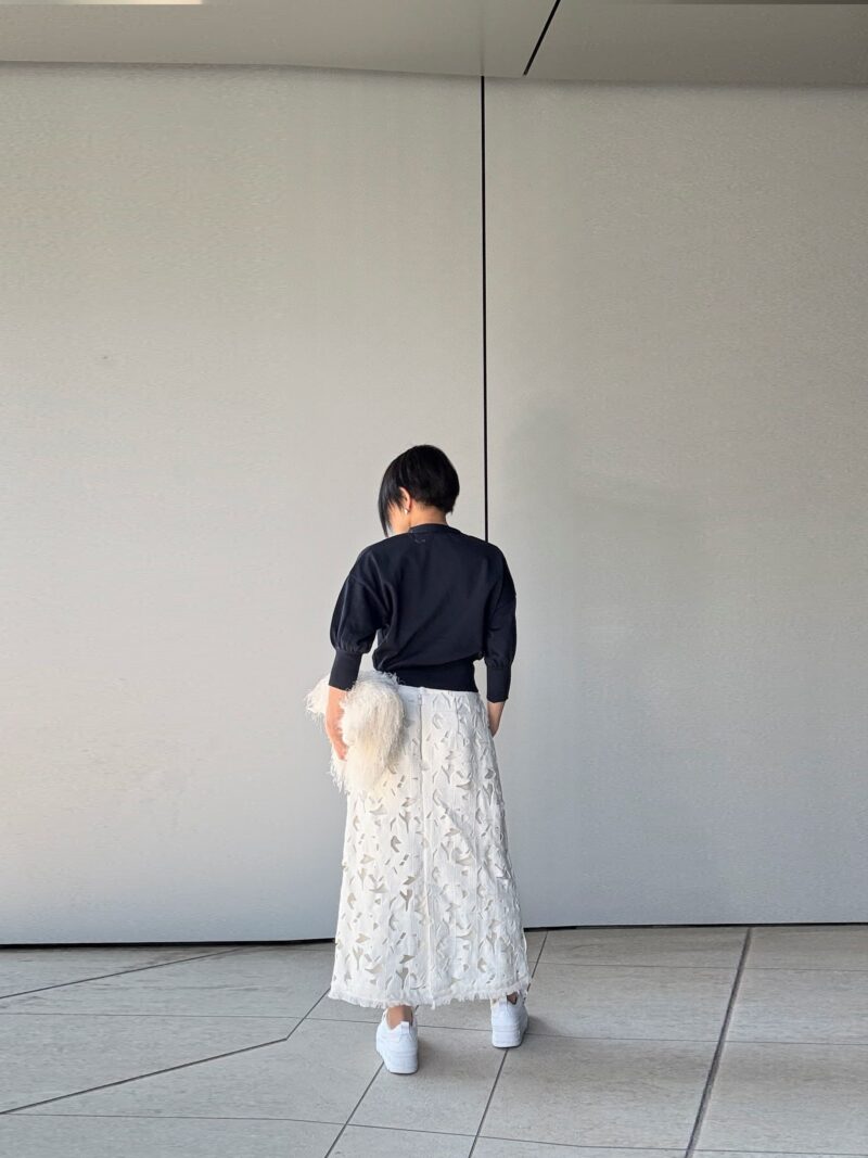 足元を厚底スニーカーにしたの正解。ここでパンプスにすると甘すぎる。レースという素材モチーフ使ったのでどこかでカジュアルダウンさせないと。
