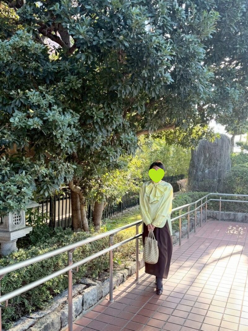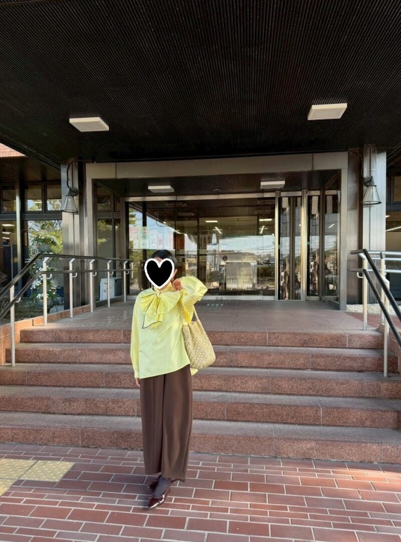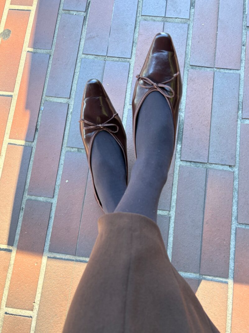 ブラウスのボウタイのトリミングの茶色を1色リンクしてワンピース・タイツ・フラットシューズをこげ茶でまとめた。つながったかな。