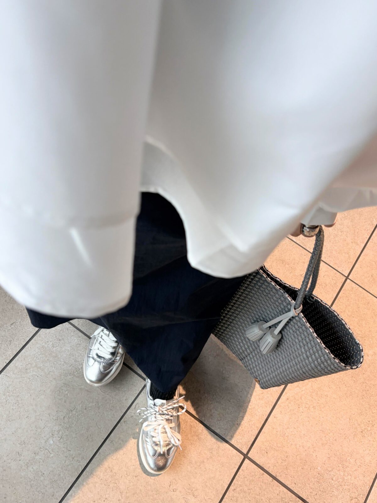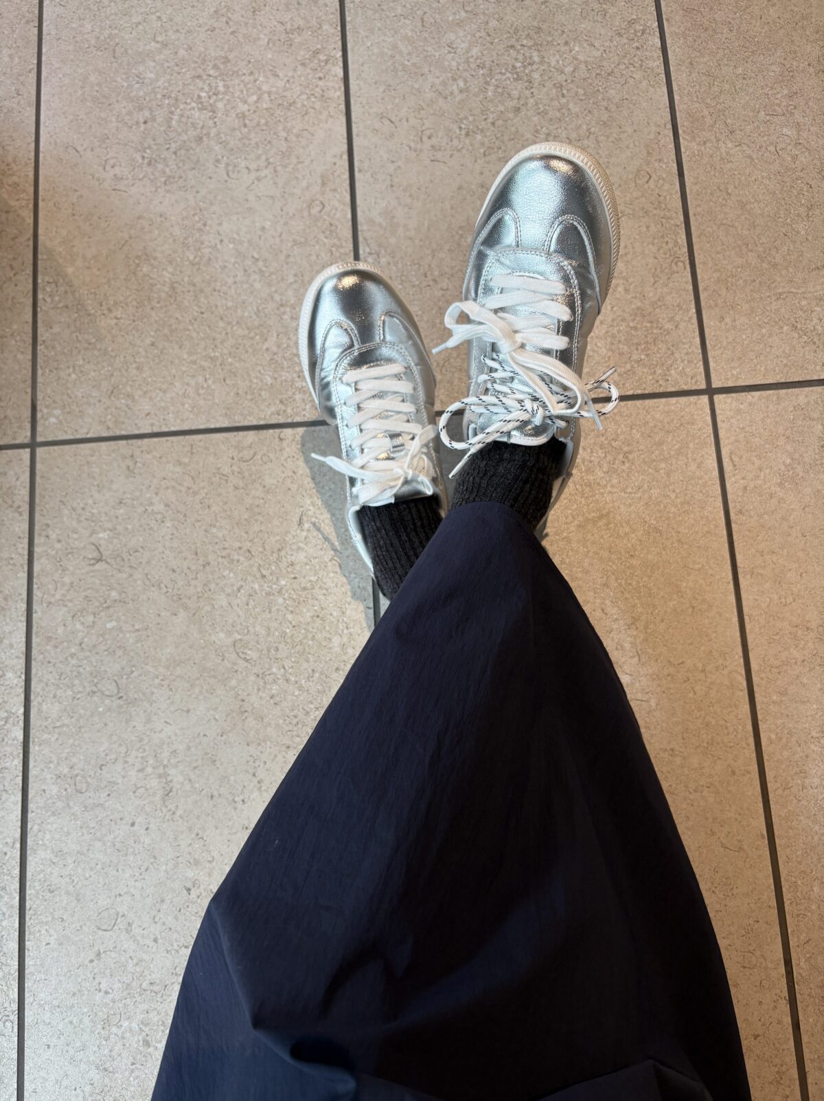 足元。シルバーのスニーカーは万能。重くならず、「服との色が微妙に合わない問題」を超越する。だってほら、シルバーだから(*´▽`*)