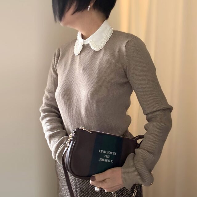 UNITEDARROWSユナイテッドアローズ 丸首ニットに飾り衿 ツイードスカードで暖かさ確保の年末コーデ
