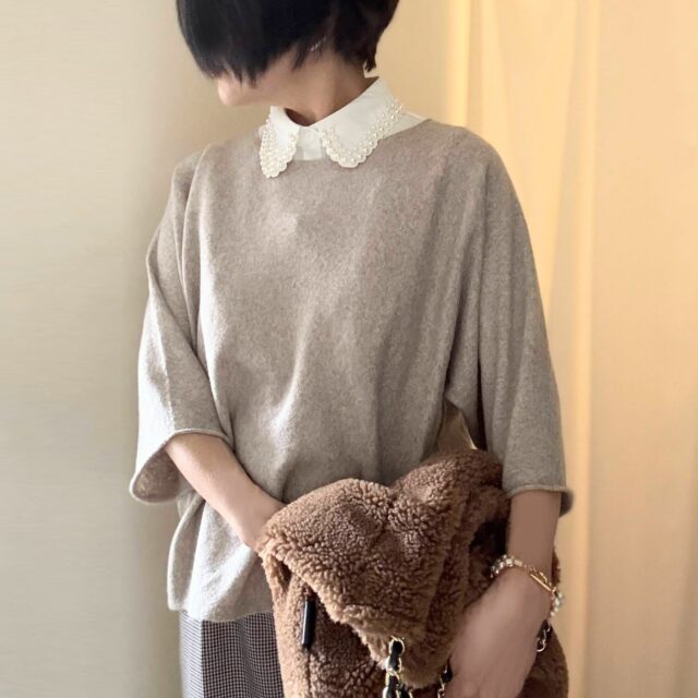 楽天ファッション レディース ドルマンスリーブの7分袖ニット 付け襟プラスで端正コーデ すごく柔らかいウール混紡のニット。薄手なんだけど伸縮性もあり、ユルッと着れてシンプルな形。これを今日は千鳥格子のおじパンツと合わせて端正コーデ。 ボートネックで7分袖なのがニクイ!!レイヤードで着てもいいし、一枚でサクッと着ても抜け感でる。... 2025.10.15 楽天ファッション レディース