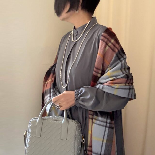 50代 ワンピースのコーデ グレーのシャツワンピース チェックのカシミアストールのコーデ