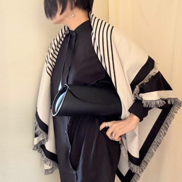 50代のバッグ選び 白黒 モノトーン! 黒のボディバッグの モードコーデ
