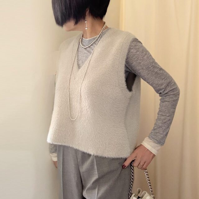 この緑のツイードニットカーディガン、後ろが短いのが面白いの。これもかなり長く着ている。このブログを始める前から着ていると思う。tomorrowlandのニット類は本当に優秀。