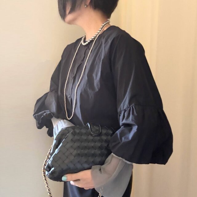 カジュアルな服にうんと大き目のパールのアクセサリーって大人っぽいなあ。
